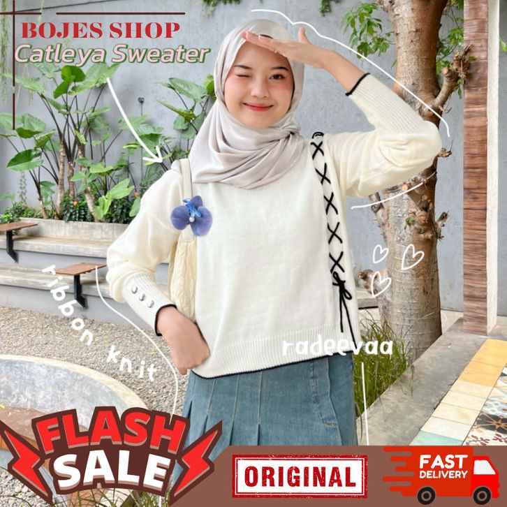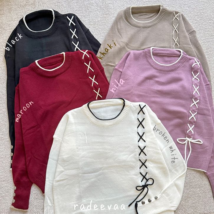 Catleya Sweater Pita Knit Ribbon Cross Button Atasan Wanita Rajut Korean Style
