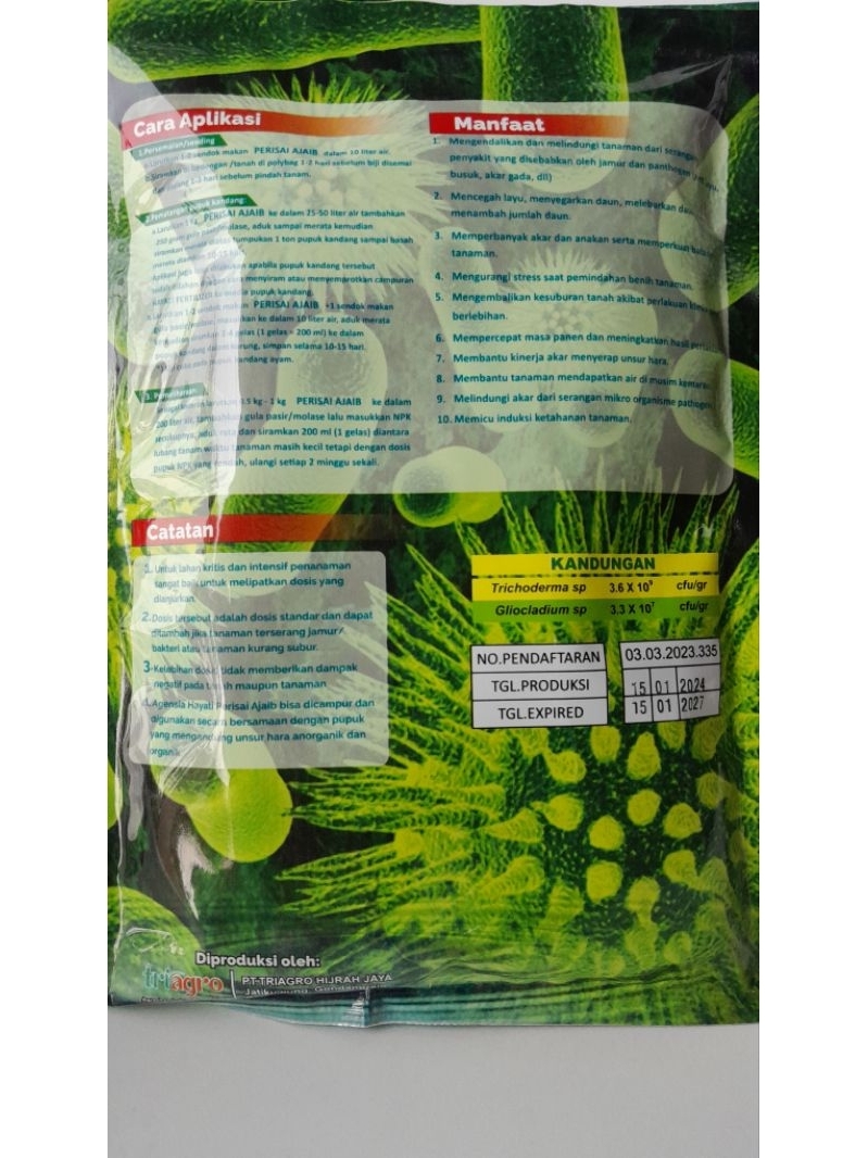 Trichoderma 500 gr. fungisida, anti layu fusarium, patek ,akar gada, busuk akar dan cegah patogen.