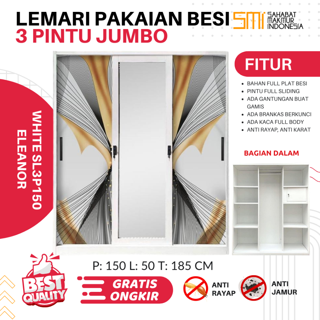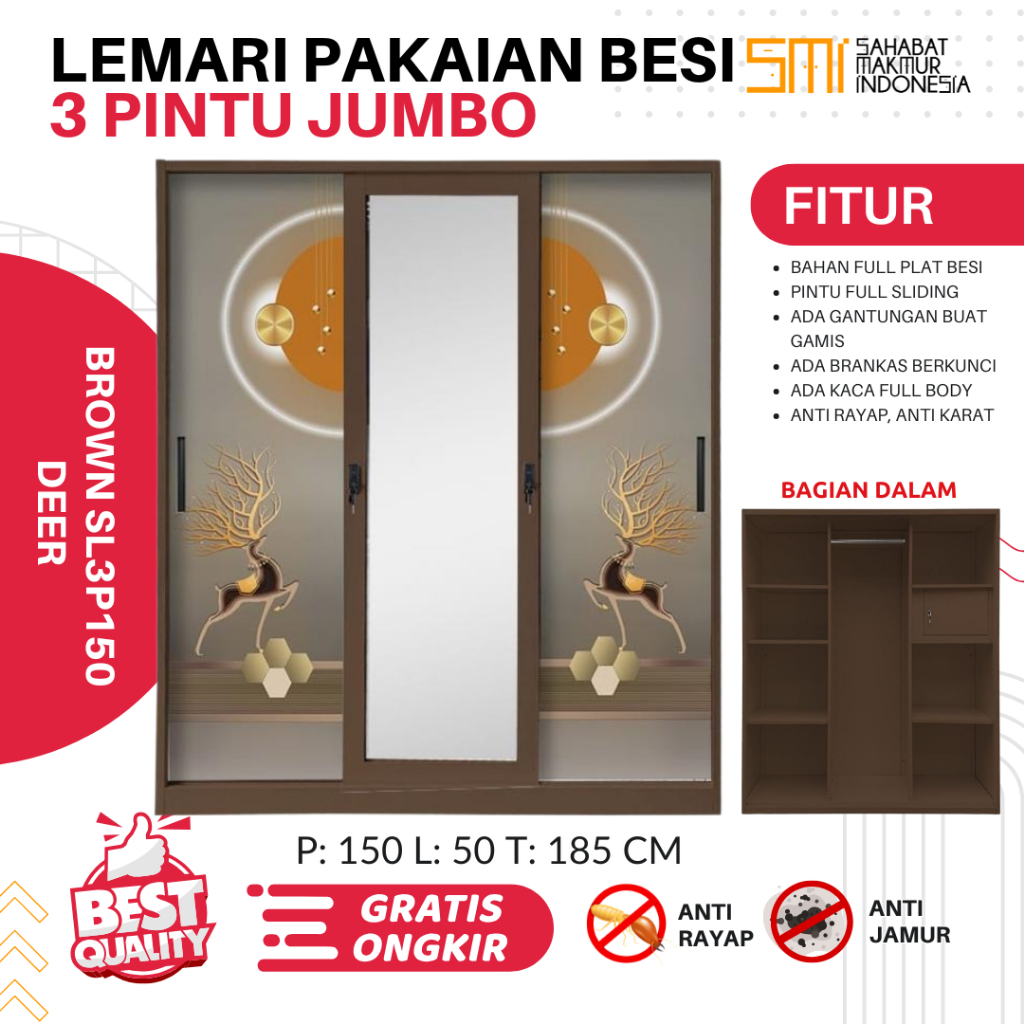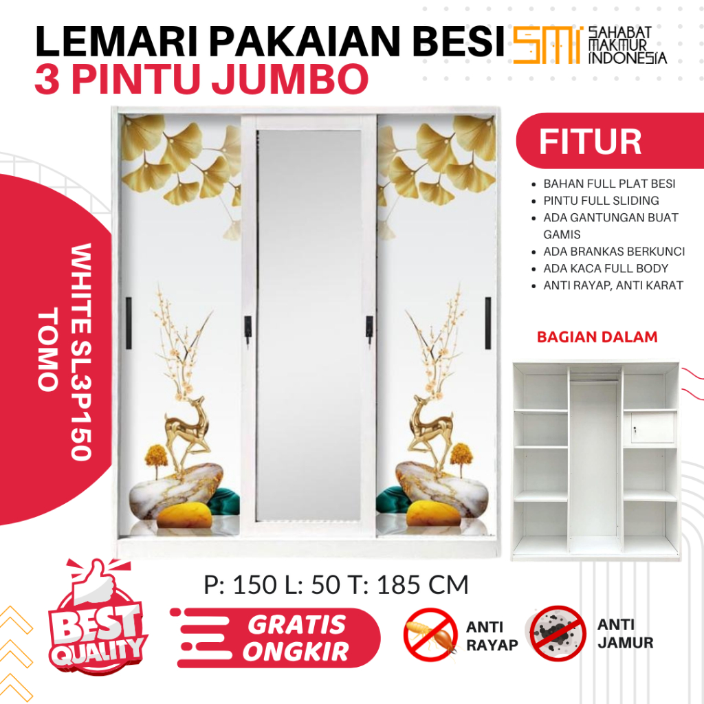 Lemari Besi 3 Pintu Jumbo - Lemari Baju Lemari Pakaian Sliding Lemari Besi Sliding 160cm Almari Baju