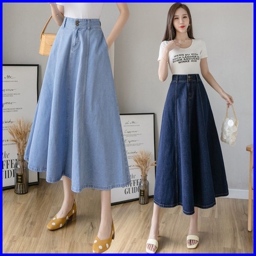 Korean Rok Jeans Maxi Skirt A-line Panjang Wanita Pinggang Highwaist Outfit Remaja Terbaru