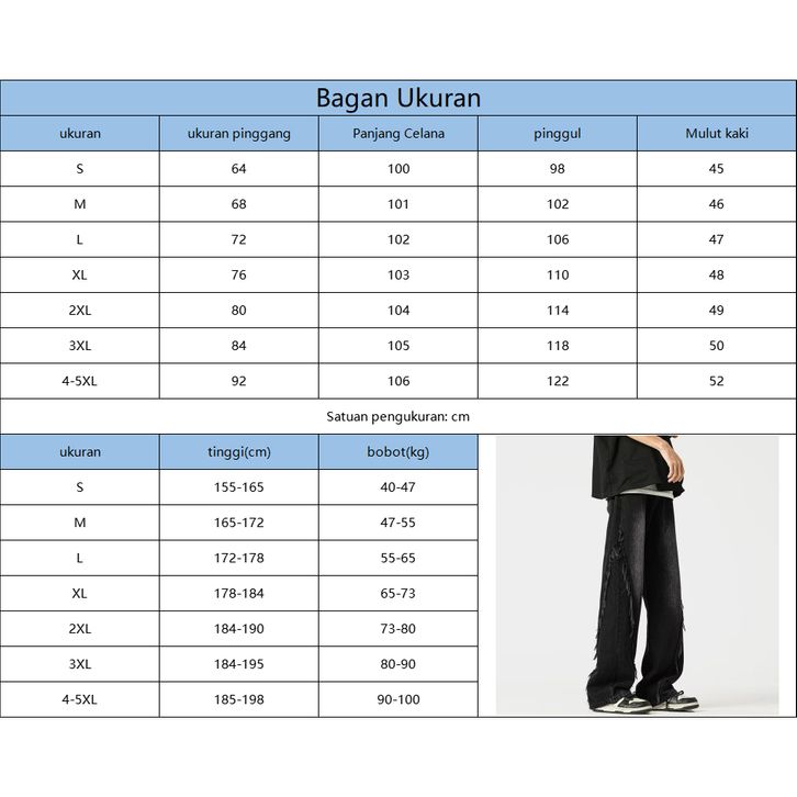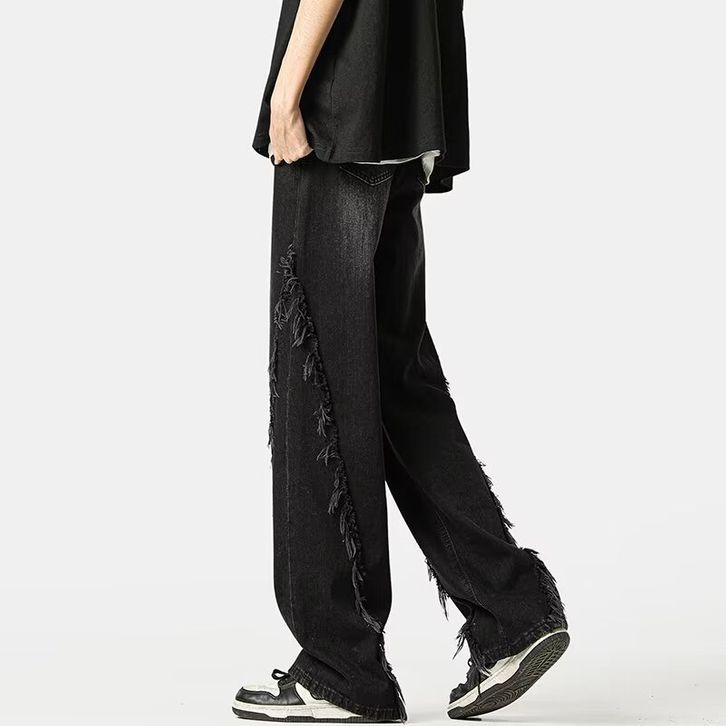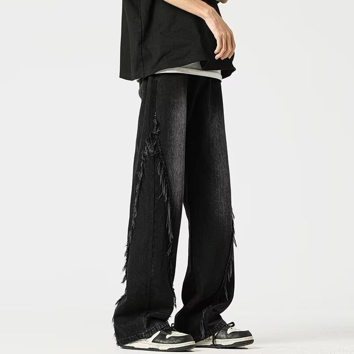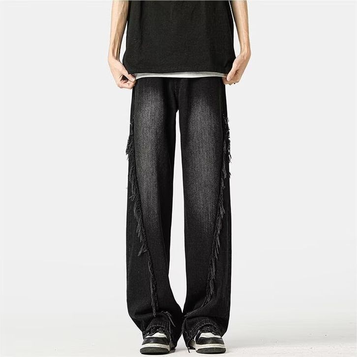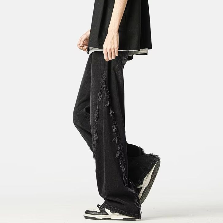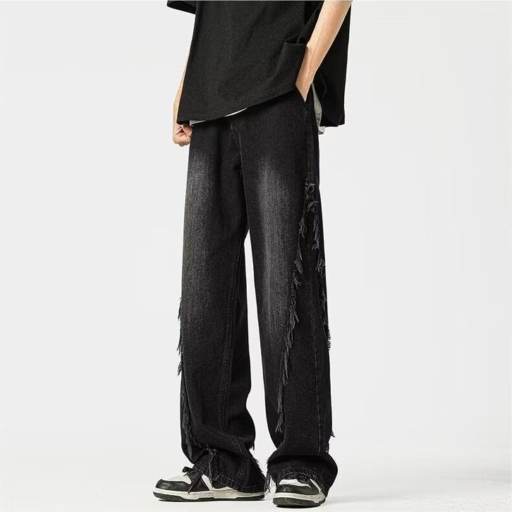 celana jeans pria baggy skena denim retro hitam jumbo cowok Jeans dengan ujung mentah korean style oversize kulot
