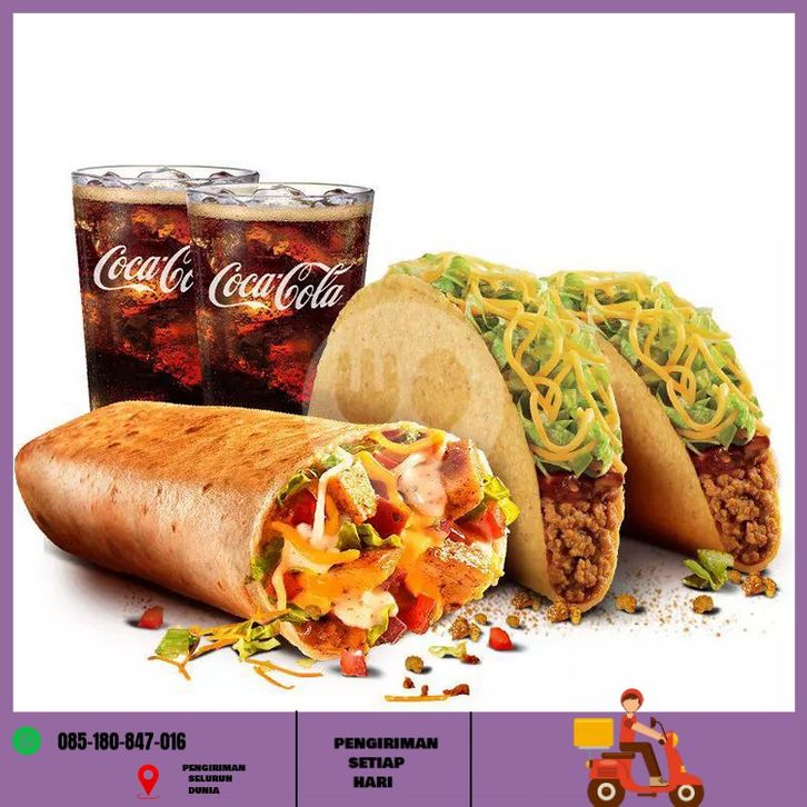 Kombo Bell Duo Uno, Kombo Bell Duo Dos, Value Fiesta With Taco, Kombo Chimichanga, Super Bell Bowl, Kombo Bowl and Blast, New Party Pack 1, New Party Pack 2, Kombo Double Stacked Taco, Kombo Double Stacked Taco Supreme, Kombo Bell Bowl Fresh, kombo Bell Bowl Pico, Kombo Bell Bowl Spicy, Combo Taco Rice Original, Combo Taco Rice Cheese, Kombo Crunchy Taco Supreme, Kombo Soft Taco Supreme, Kombo Crunchy Taco, Kombo Soft Taco, Kombo Kickin Chicken Taco, Kombo Naked Chicken Taco, Kombo Chicken Quesadilla, Kombo Cheese Quesadilla, Kombo Grilled Stuft Buritto, Kombo Cheesy Burrito, Kombo Bell Rice Kebuli, Double Stacked Taco, Double Stacked Taco Supreme, Crispy Chicken, Chimichanga, Spicy Bowl, Pico Bowl, Mushroom Soup New, Fresh Bowl, Taco Rice Cheese Lovers, Taco Rice Original, Bell Rice Kebuli, Purple Bag, 2 Kickin Chicken™ Tacos, Chicken Quesadilla, 2 Crunchy Taco Supreme™, 2 Soft Taco Supreme™, Crunchy Taco Supreme™, Soft Taco Supreme™, Soft Taco, Crunchy Taco, Naked Chicken Taco™, Chickstar, Grilled Stuft Burrito, Kickin Chicken Taco, Fries, Cheesy Roll, Nacho Fries, Cheesy Chips, Cheese Quesadilla, Supreme Loaded Nachos, Loaded Griller, Naked Chicken Chips with Cheese, Mexican Wings 4, Sharabl Platter, Mexican Wings 8, Loaded Fries Med, Creamy Jalapeño, Sambal Korek, Creamy Ranch, Nacho Cheese Sauce, Sour Cream, Kickin Sauce, Pico De Gallo Salsa, Coke Zero, Lychee Blast, Coca-Cola Float, Fanta Float, Sprite Float, Coke, Fanta Strawberry, Sprite, Cola Lemonade, Pink Lemonade, Lemonade, Manggo Freeze, Mineral Water 330 ml, Iced Latte, Cappucino, Americano, Caffee Latte, Iced Americano, Hot Tea, Chocodilla, Cinnamon Tostada, Kombo Bell Duo Uno