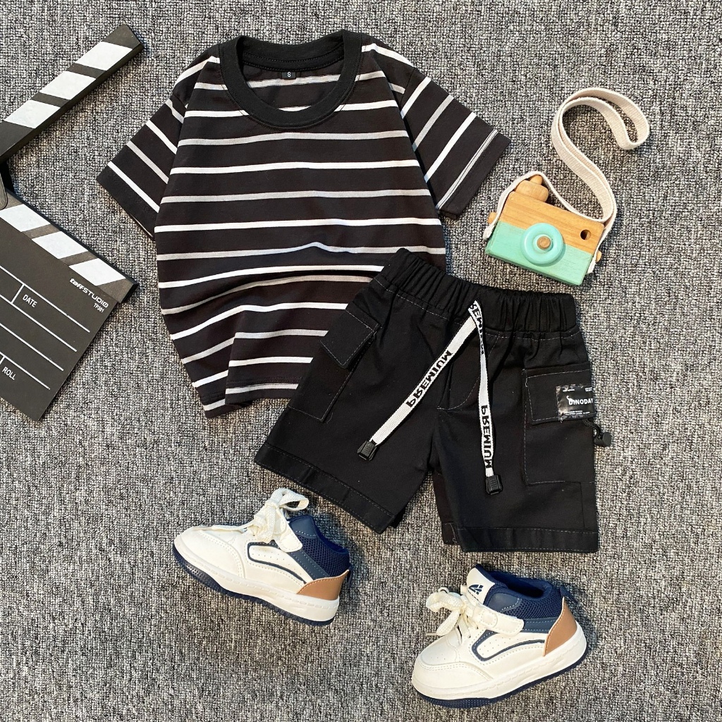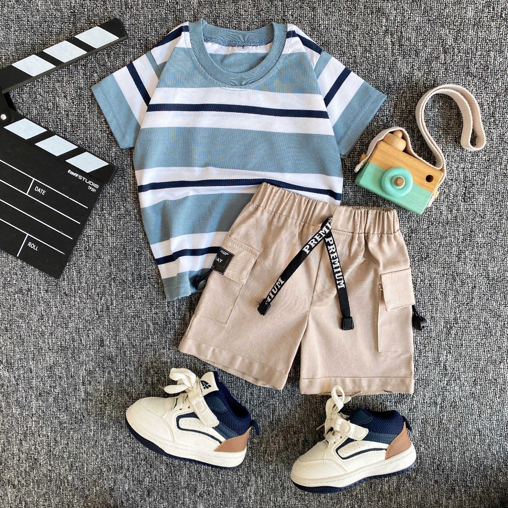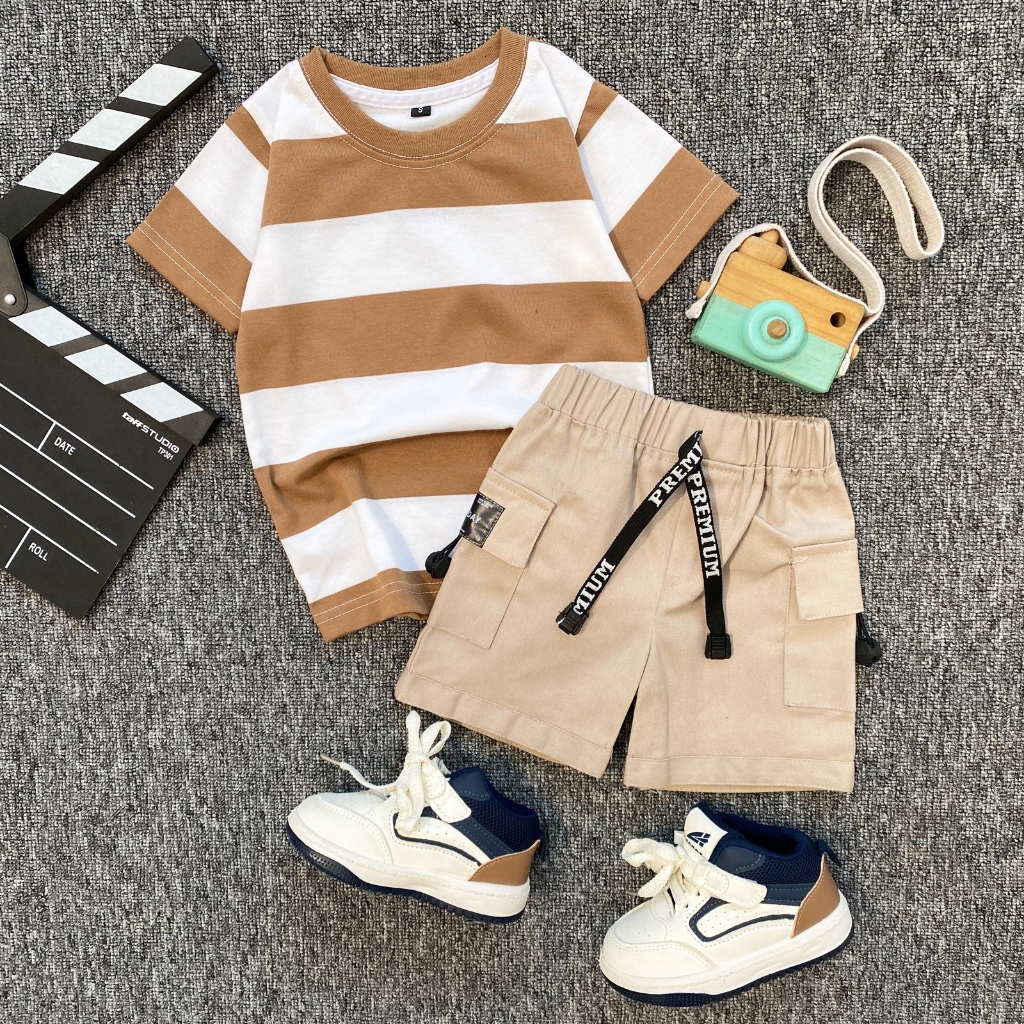 SETELAN Baju AnakESTISHOP setelan baju kaos salur anak laki laki perempuan celana pendek cargo korean style 1-7 Tahun