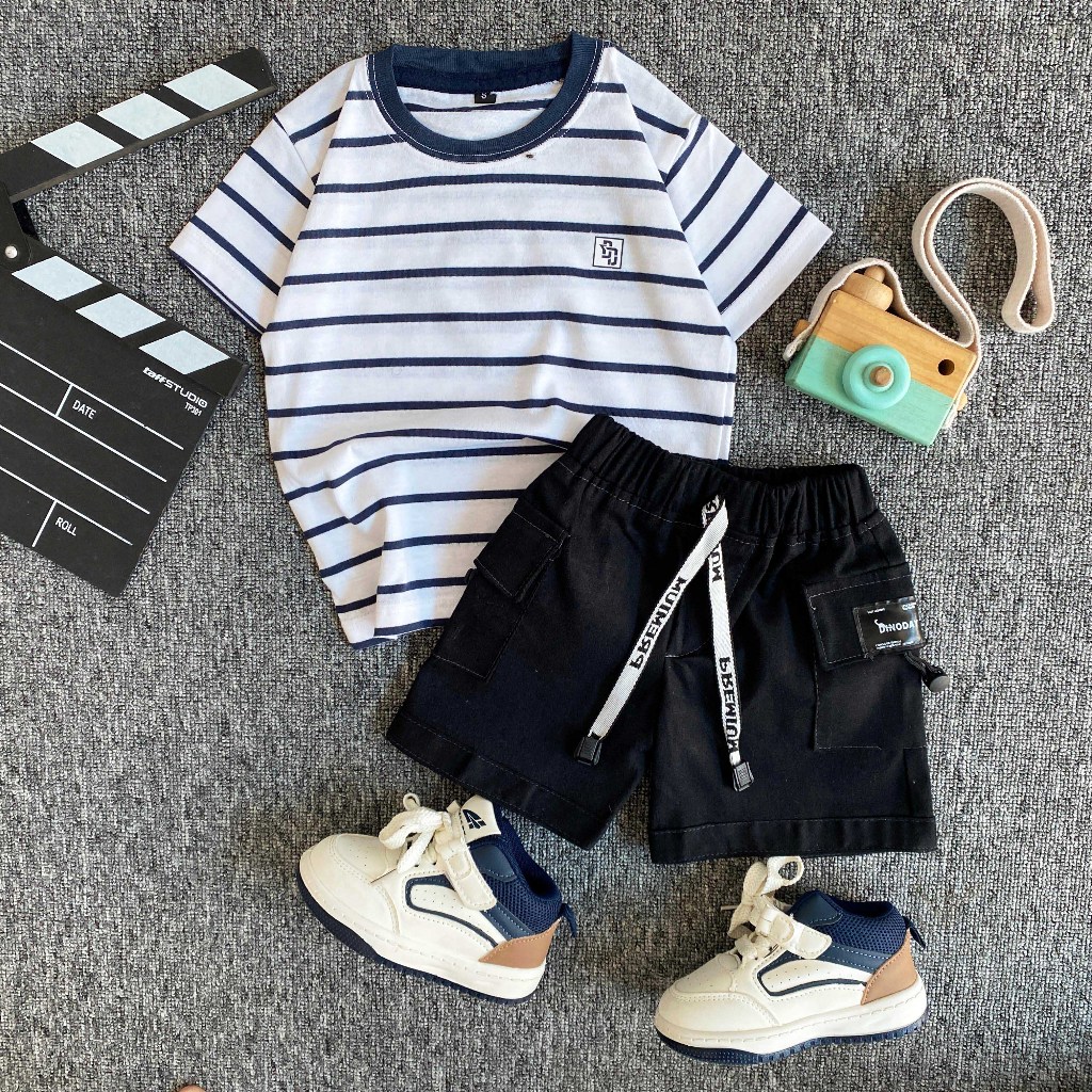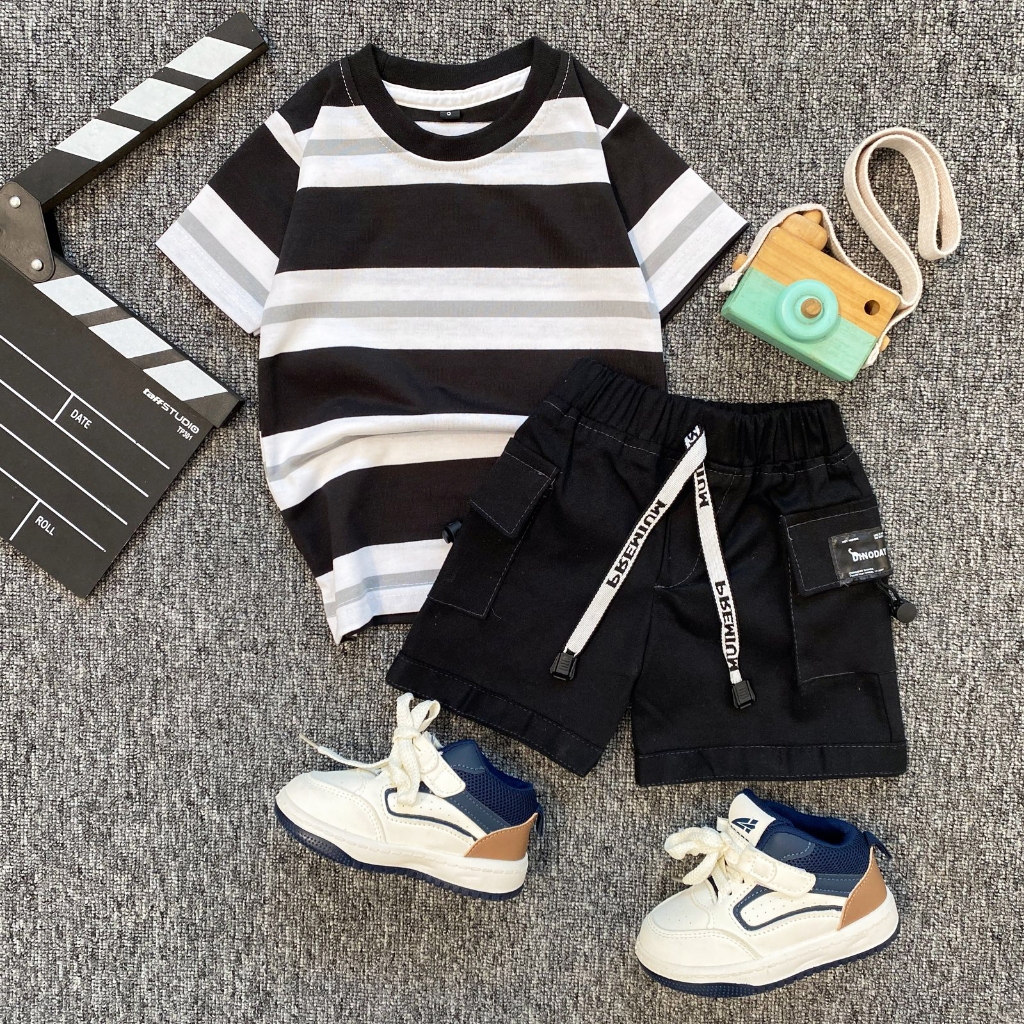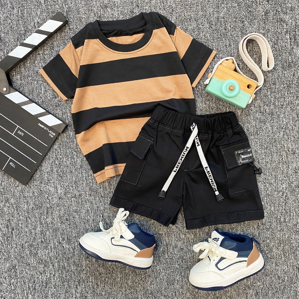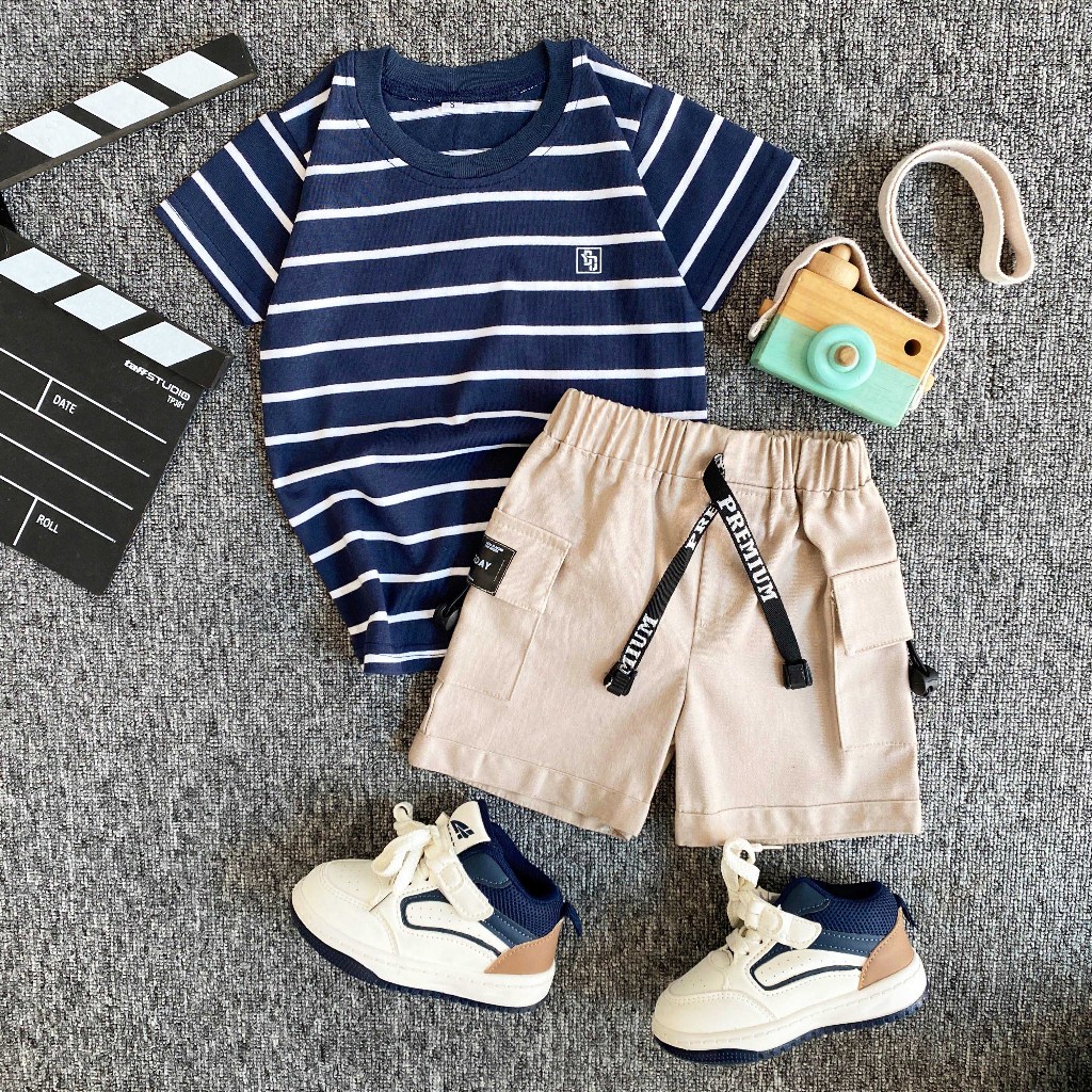 SETELAN Baju AnakESTISHOP setelan baju kaos salur anak laki laki perempuan celana pendek cargo korean style 1-7 Tahun