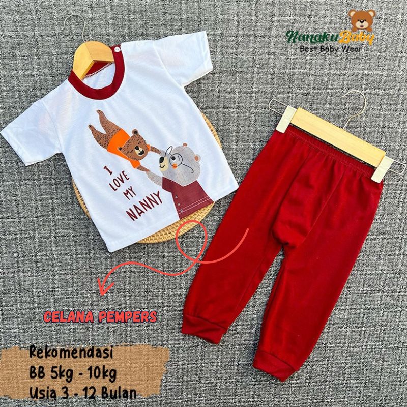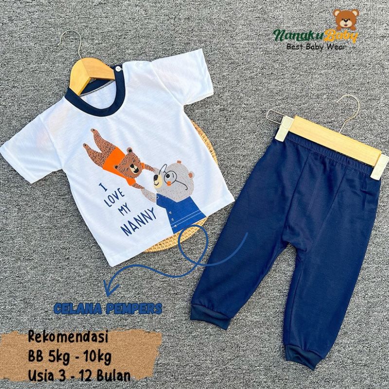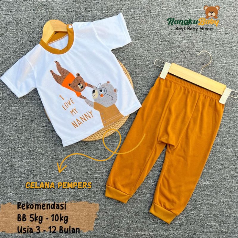 Nanaku Baby Setelan Baju Bayi Unisex Model Lengan Pendek Celana Pempers Panjang Usia 3-12 Bulan Motif Beruang Grizzly