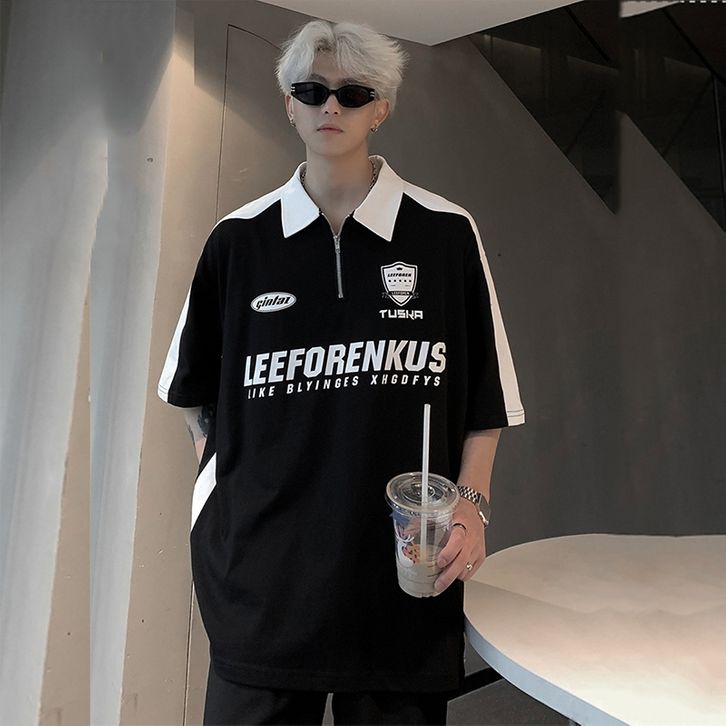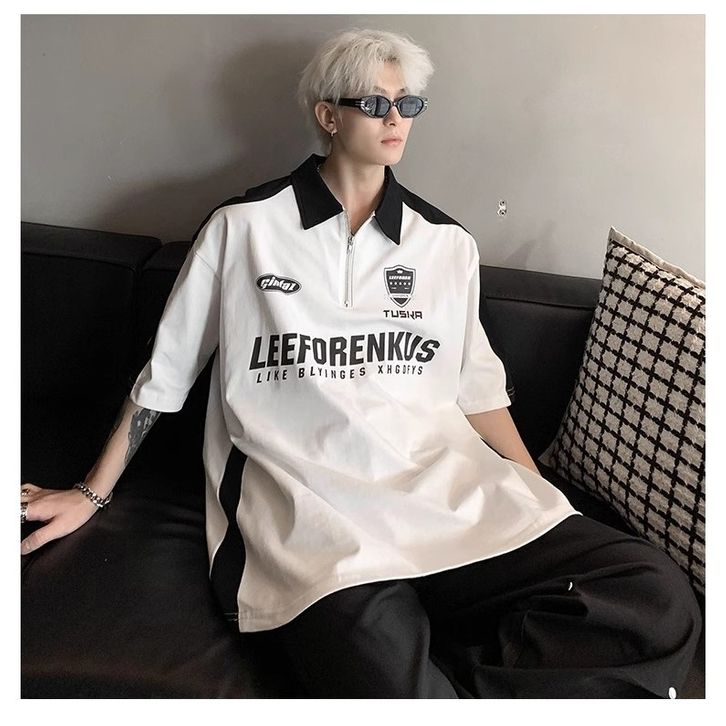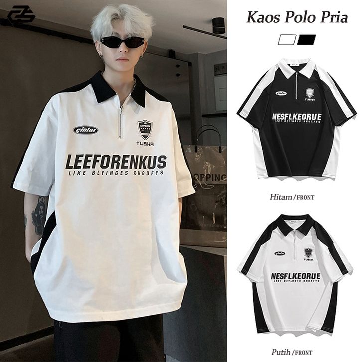 Kaos Oversize Unisex Polo T shirt Pria Black & White Korean Style lengan pendek Vintage