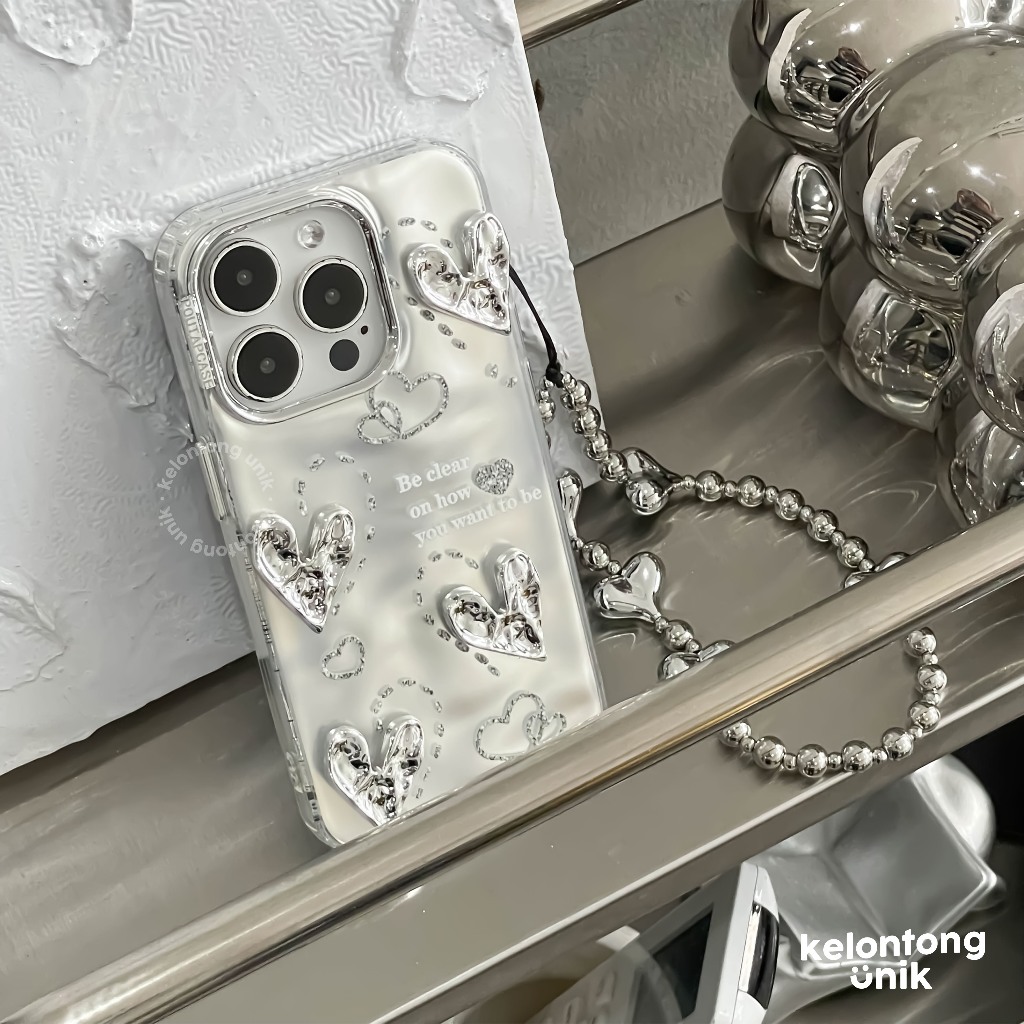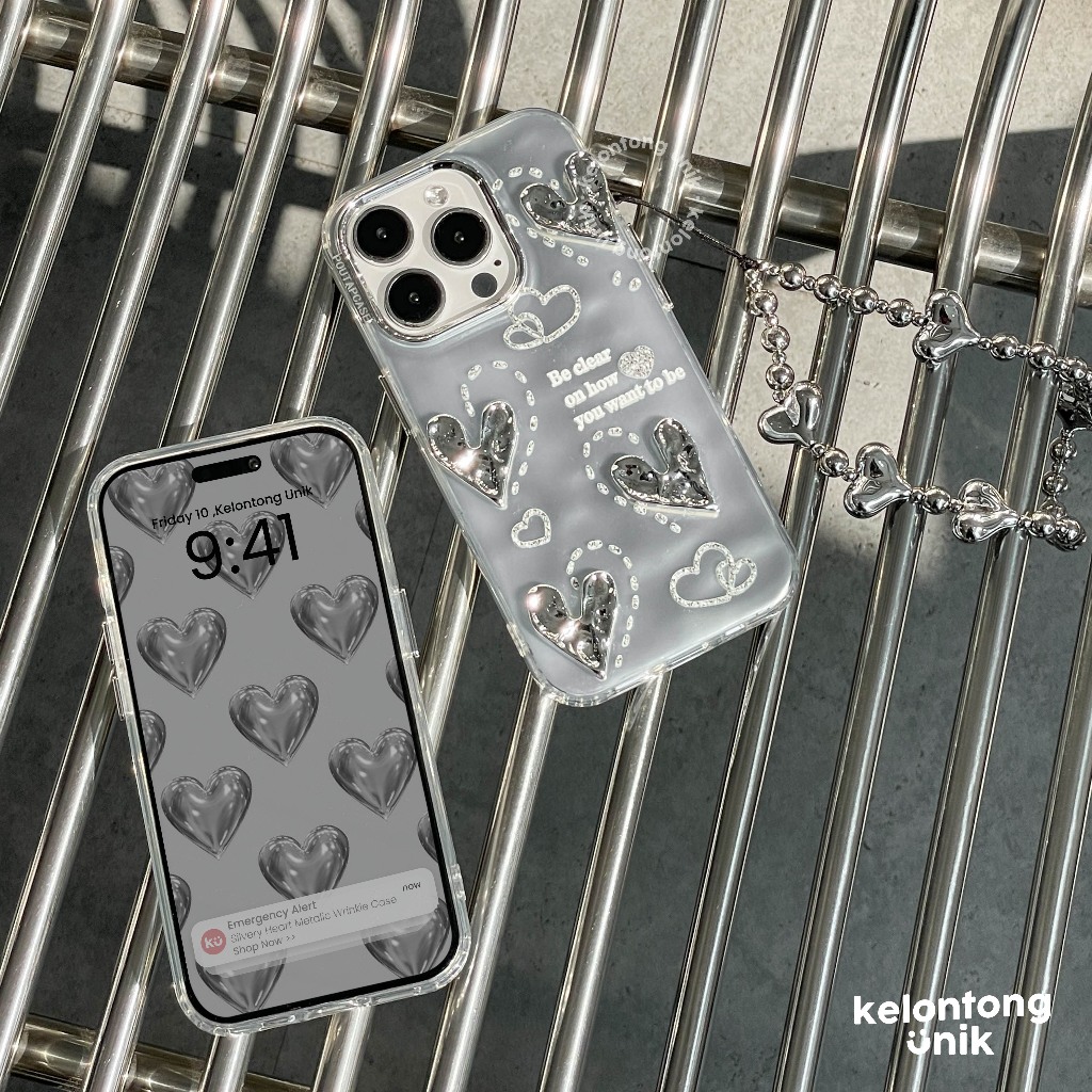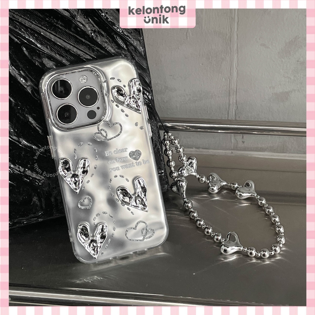 KELONTONG UNIK | Silvery Heart Metalic Wrinkle Case with Charm - Hardcase/ Casing HP for iPhone 11 12 13 14 15 16 PRO PR