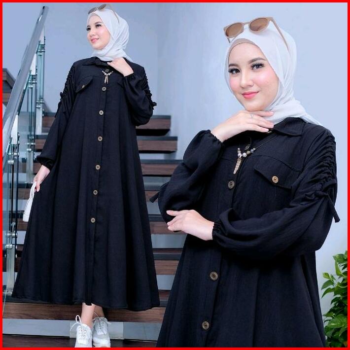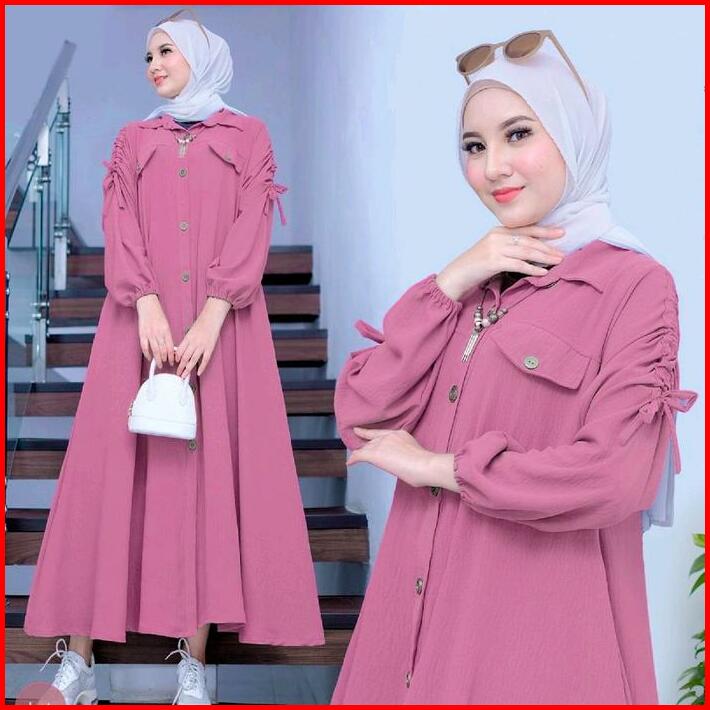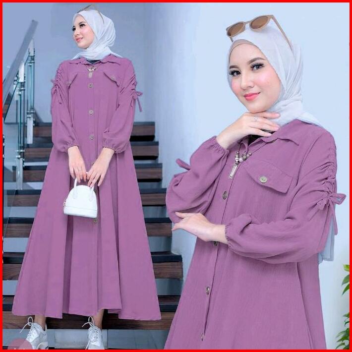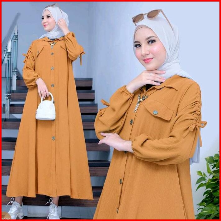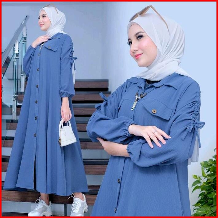 Mahalini Midi Dress Midi Dress Muslim Variasi Kancing Crinkle Airflow Biru Panjang Serut Gamis Maxi Wanita Remaja Simple