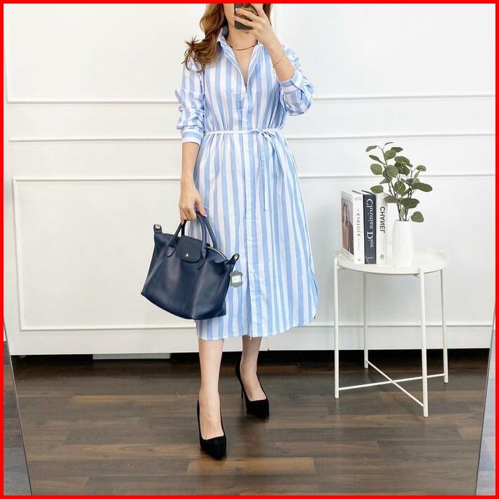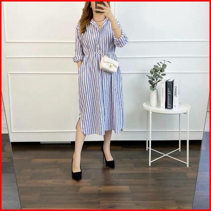 Elena Closet Stripe Tunik Tangan Panjang Wanita Katun Salur Kekinian Allsize Baju Casual Midi Dress Kancing