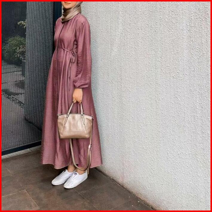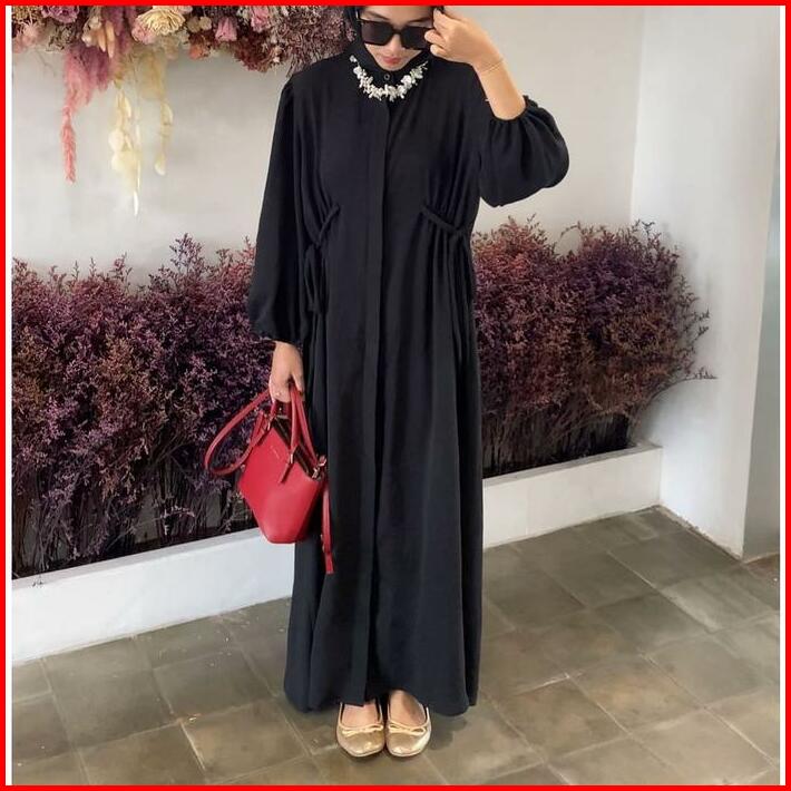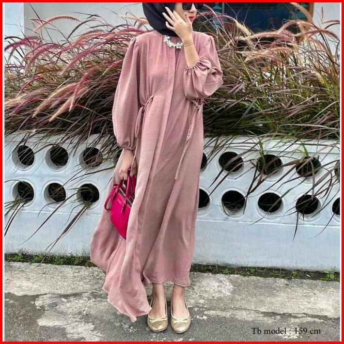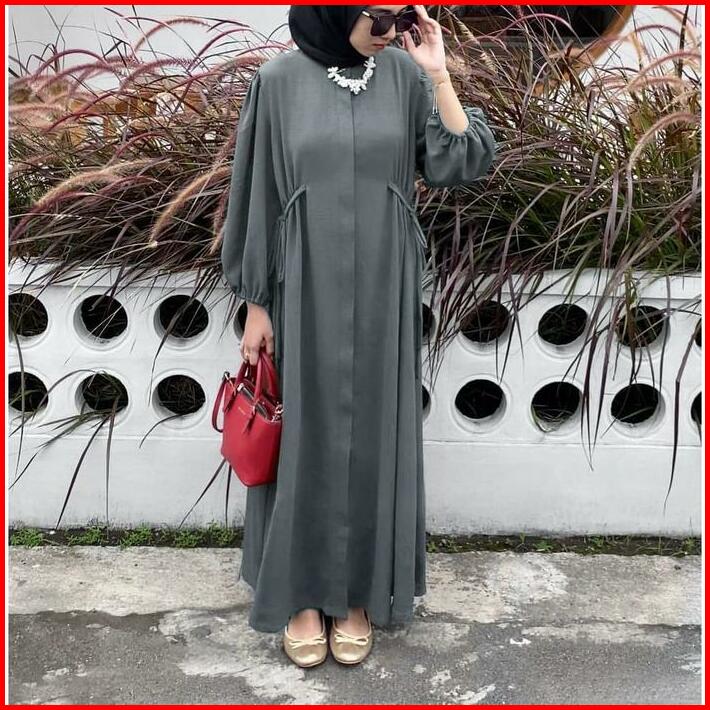 Gamis Midi Dress Linen Tali Pinggang Hazzel Wanita Dewasa Ful Kancing Variasi Tali Pinggang Pakaian Dress Muslim Panjang