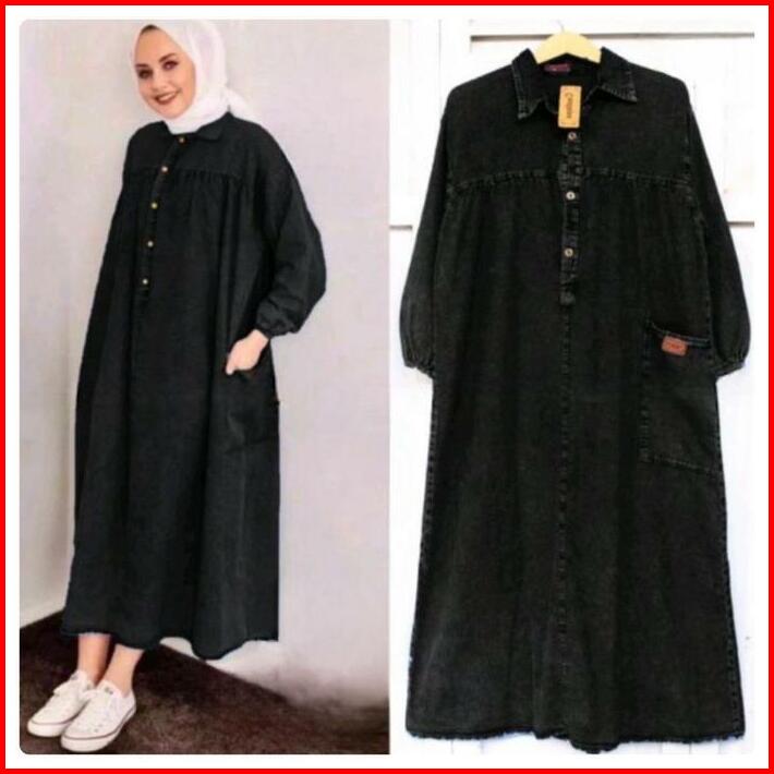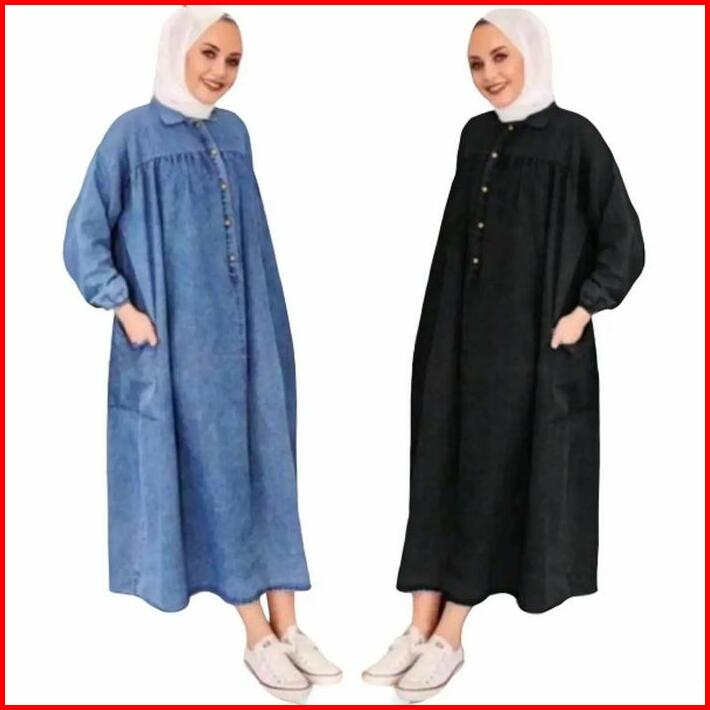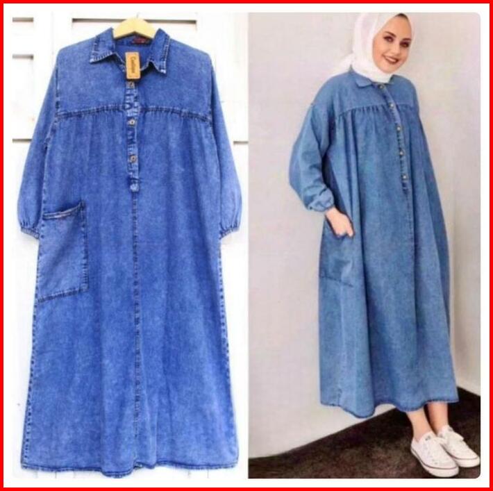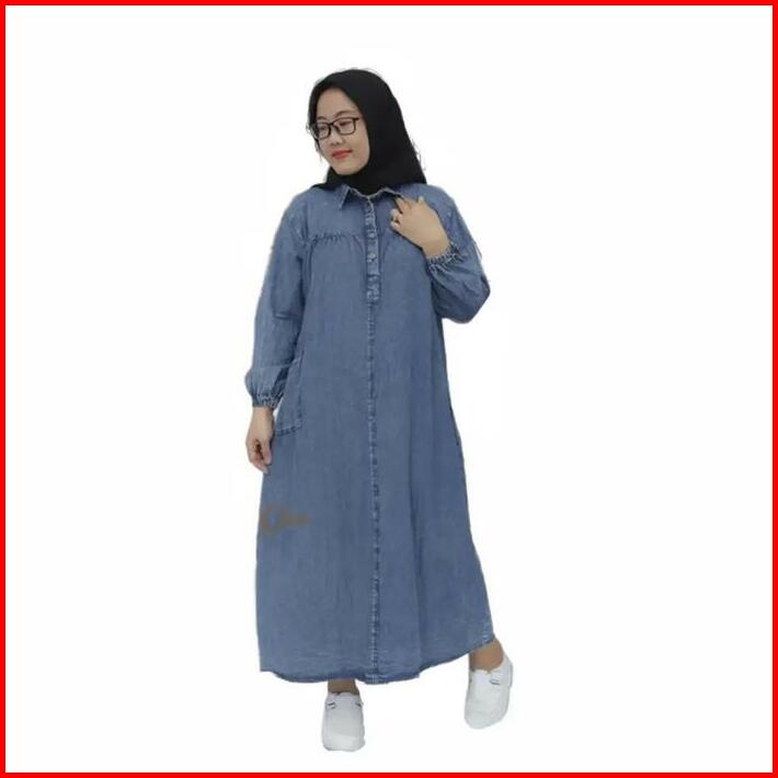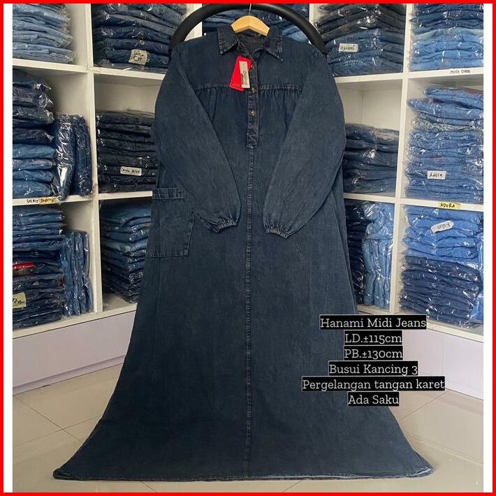 Hanami Midi Dress Jeans Wanita Muslim Dewasa Lengan Panjang Variasi Kancing Karet Simpel