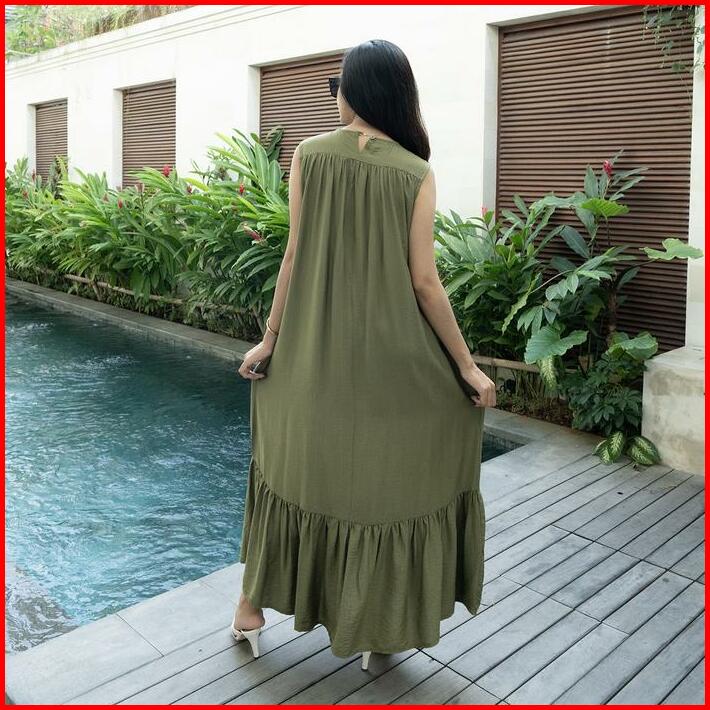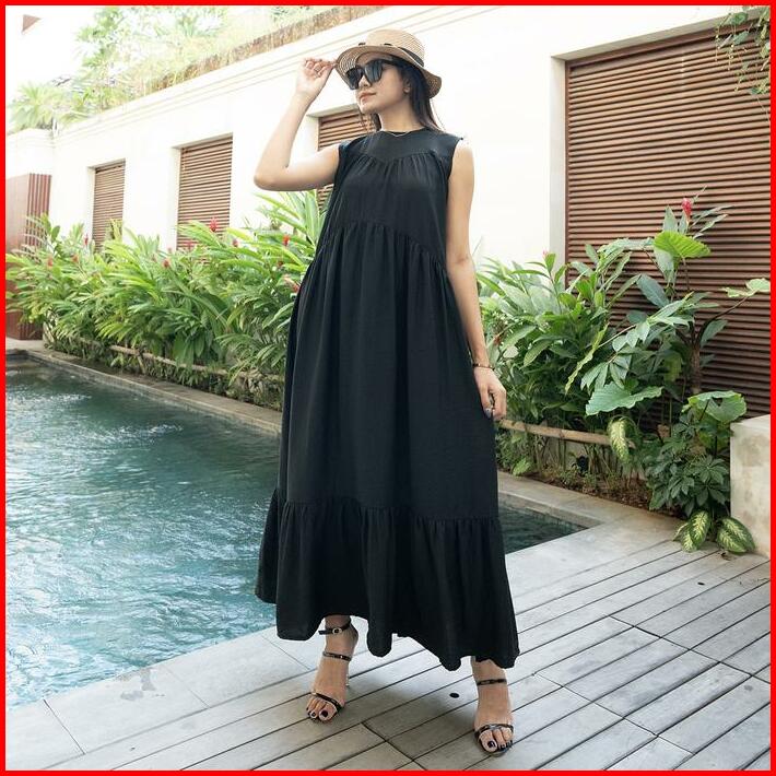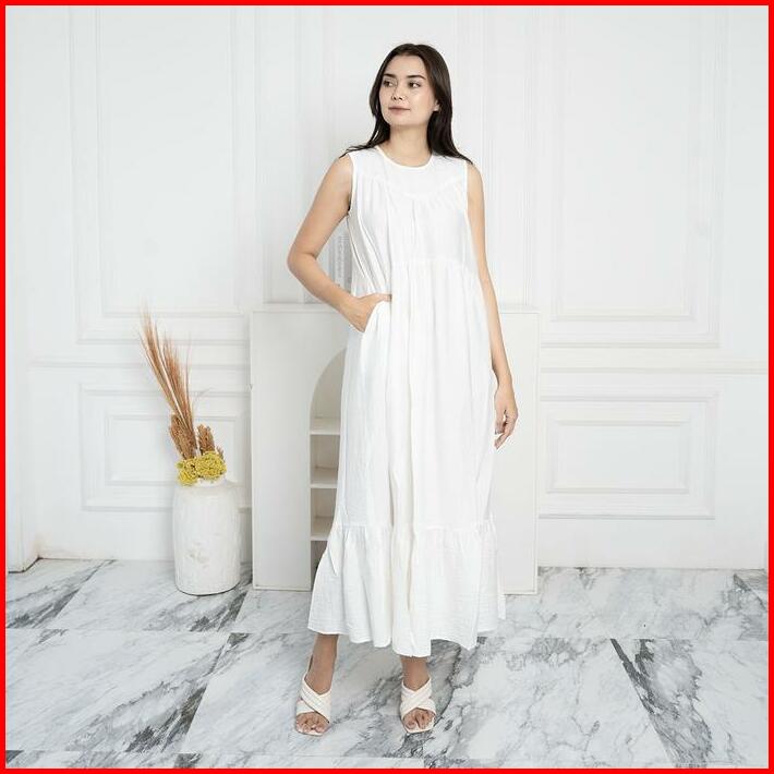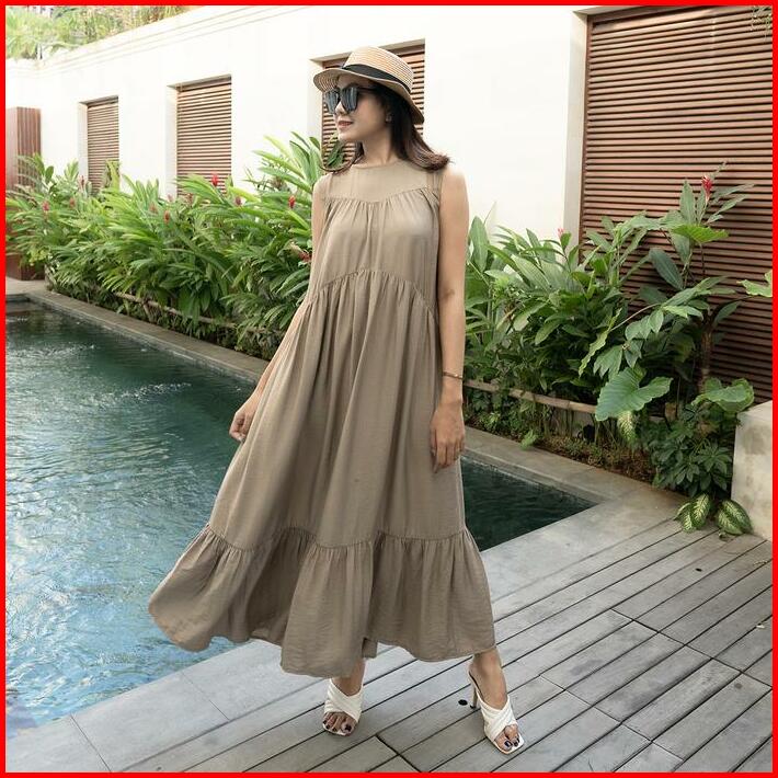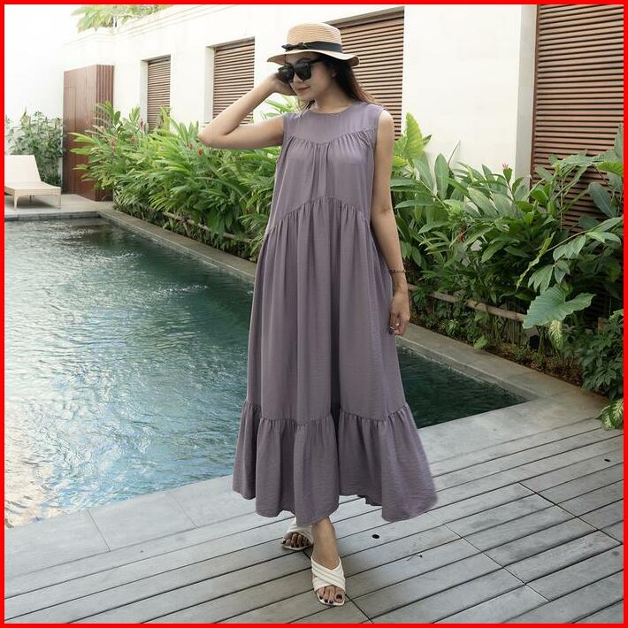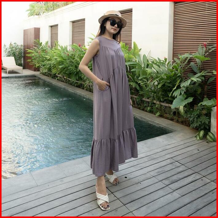 Simplyrooms Sisy Dress Korean Elegan Santai Polos Gaun Casual Ruffle Kantong Nyaman Panjang Garis Kancing Midi Basic