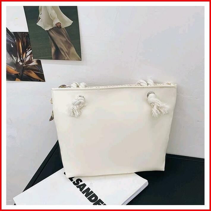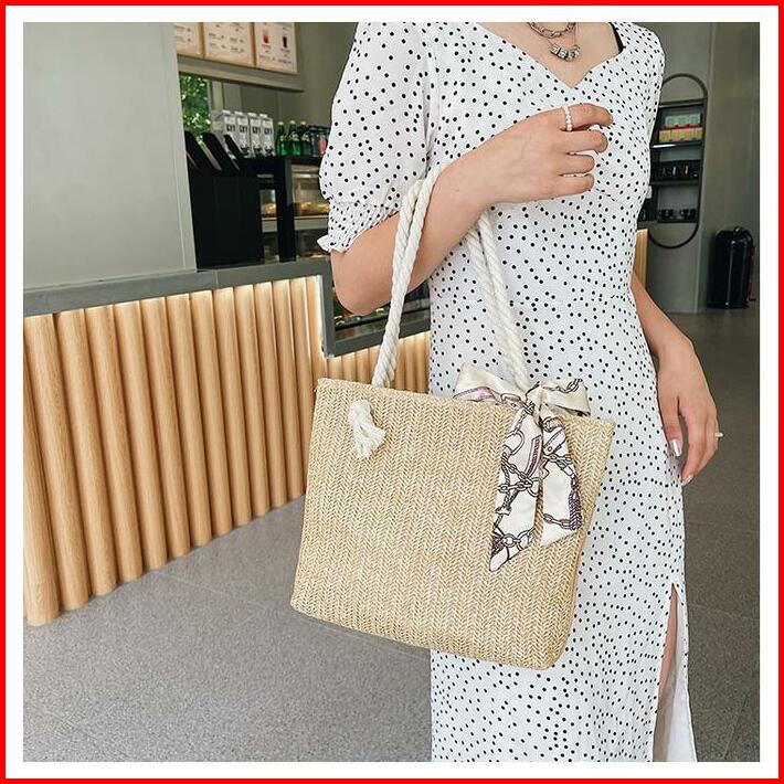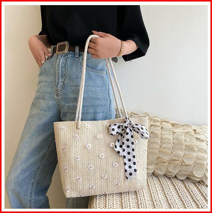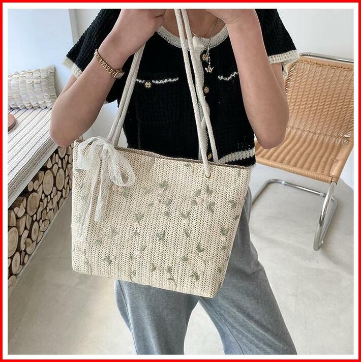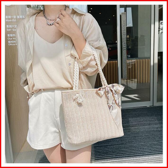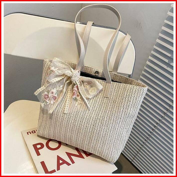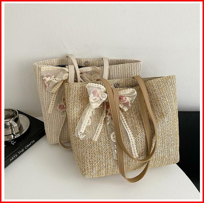 Tas Tote Wanita Bahan Anyam Jerami Motif Lace Pita Totebag Fashion Korea Motif Lace Pita Import Pink