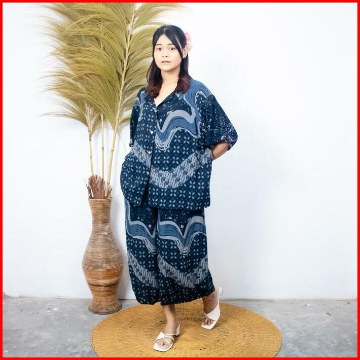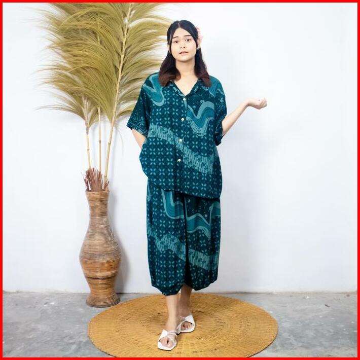 Oneset Elira Dewi Sri Jumbo Full Kancing Setelan Wanita Dewasa Motif Katun Rayon Celana Panjang
