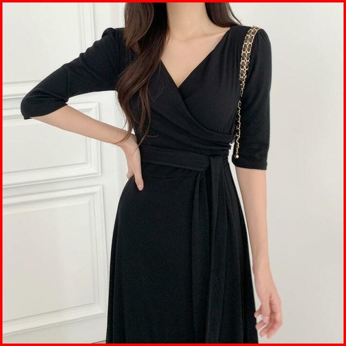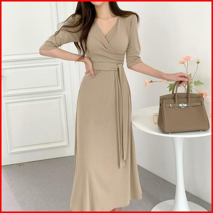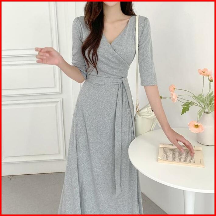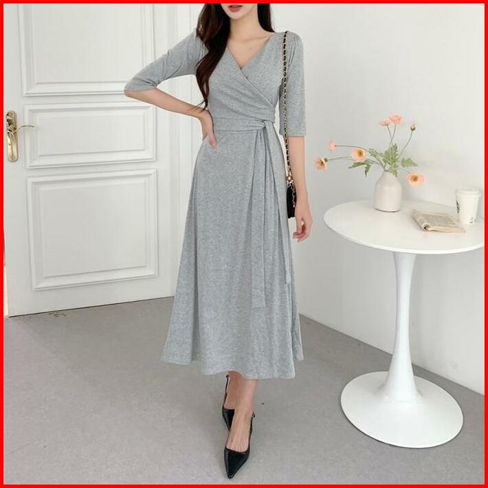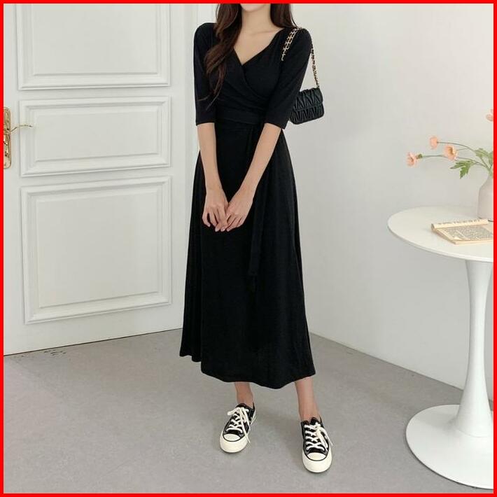 Ada Size Jumbo D1083 Medali Korean Style Vintage Midi Dress Polos Jalan Polos Santai Hijab Panjang Casual Simple