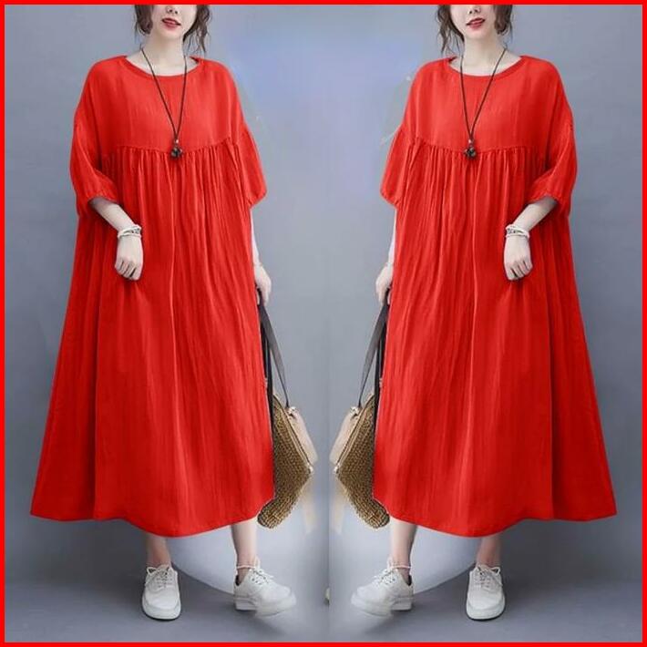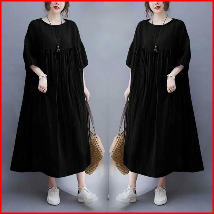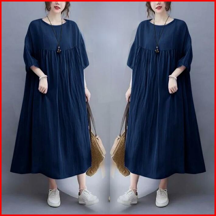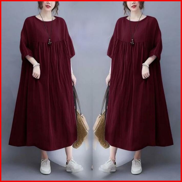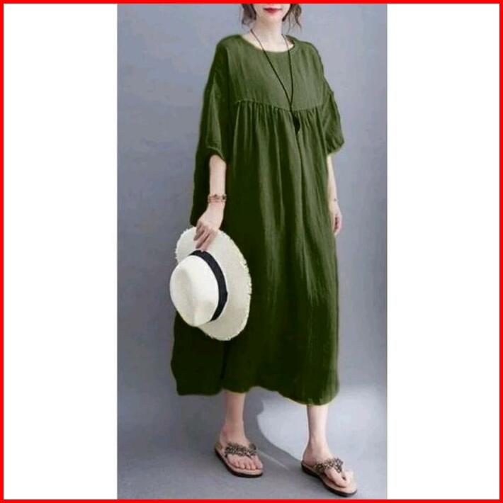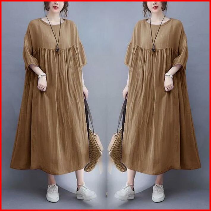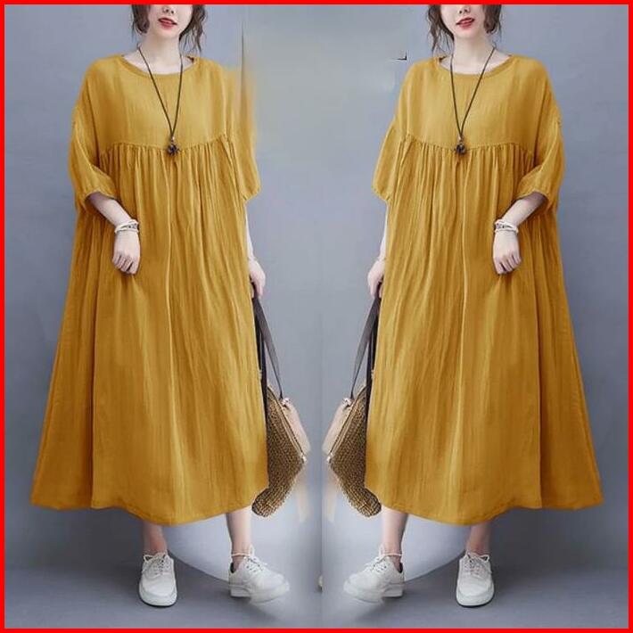 Davina Dress Jumbo Rayon Remium Lengan Karet 7 4 Dress Midi Oversize Korean Style Casual Wanita Nyaman