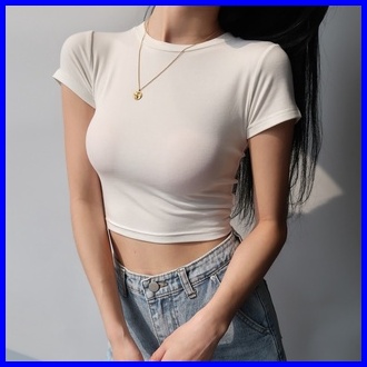 Premium99koutlet Atasan Cropped Wanita Short Sleeve Crew Neck Kaos Slim Fit Basic Tshirt Ribbed Polos S M L Xl 7302 T-sh