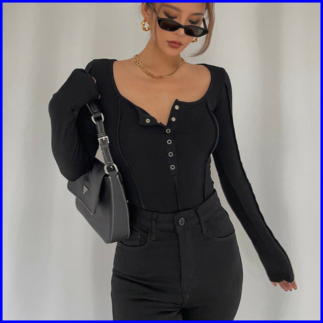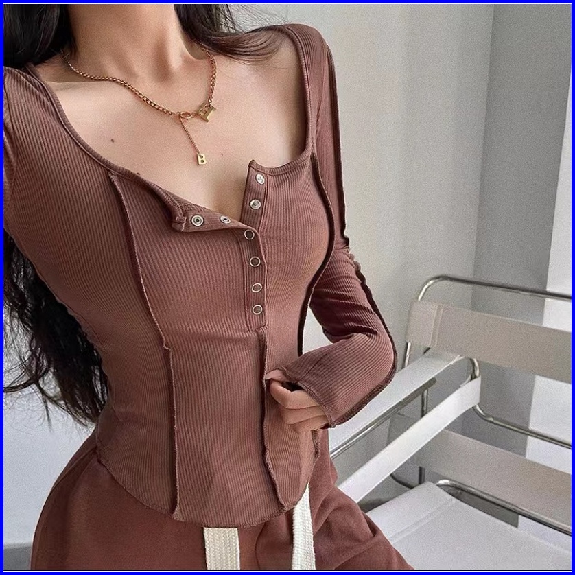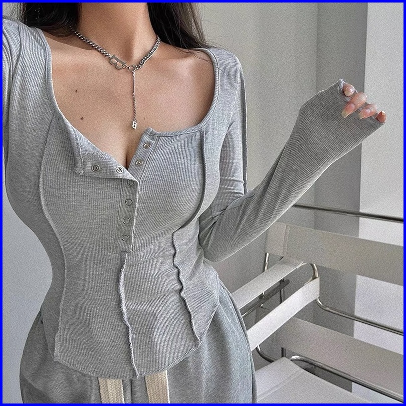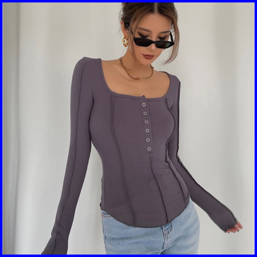 Premium U Neck Long Sleeve Button Up Slim T-shirt 7027 S M L