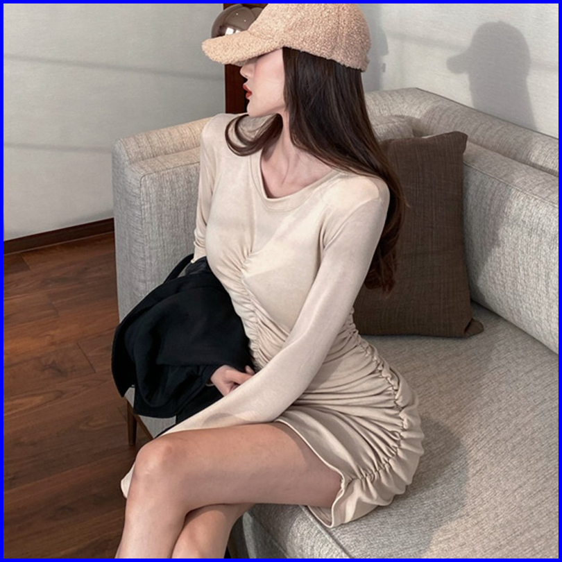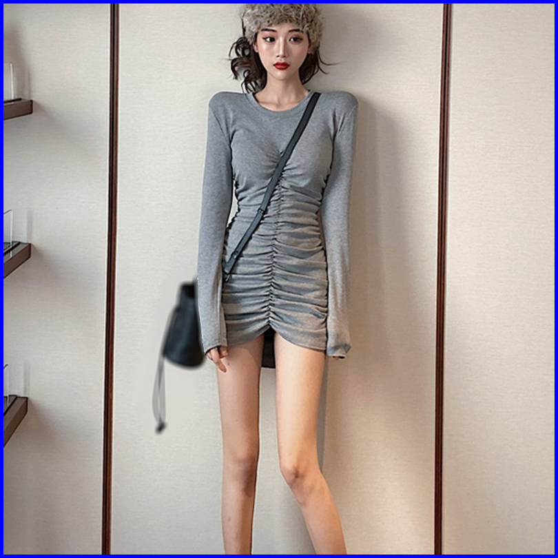 99koutlet Wanita Mini Dress Bodycon Ruffled Round Neck Lengan Panjang S M L Xl 1698 Baju Women Sexy Fitted Plain Ruffle