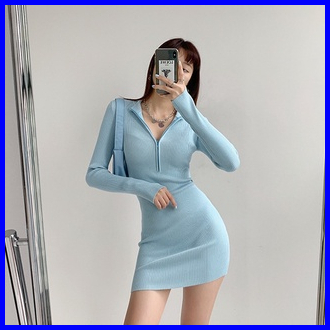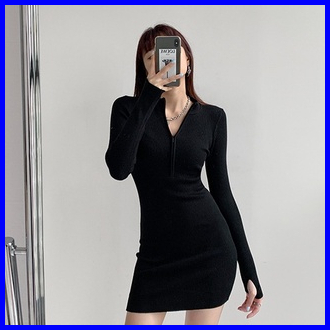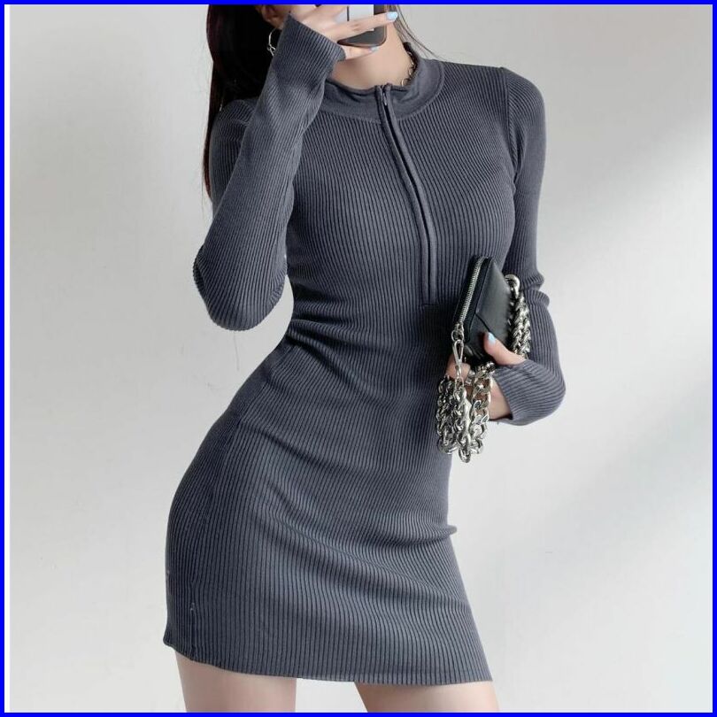 Premium Knit Zip Long Sleeve Mini Dress Bodycon 7317 S M L