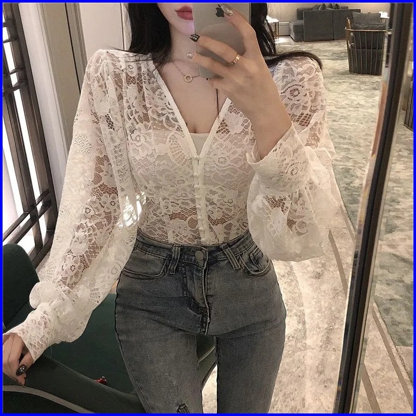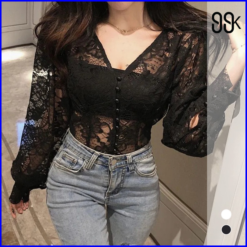 Long Sleeve Raffle Button Lace Blouse 1257 S-xl