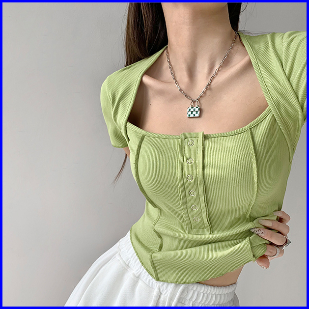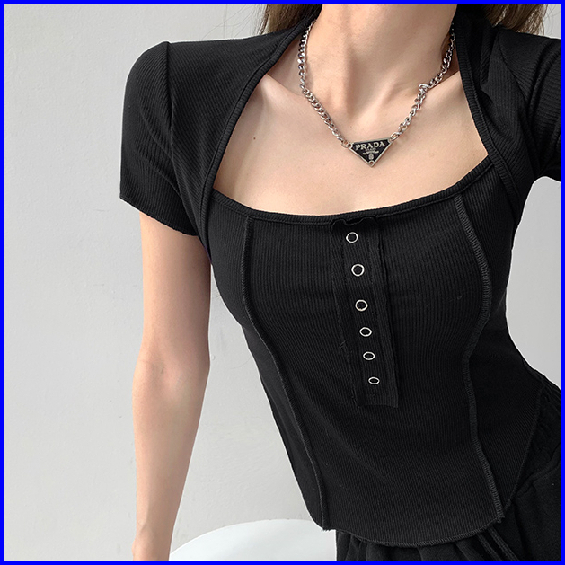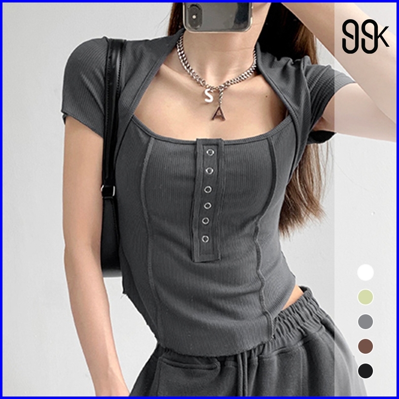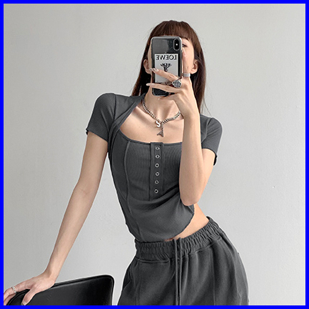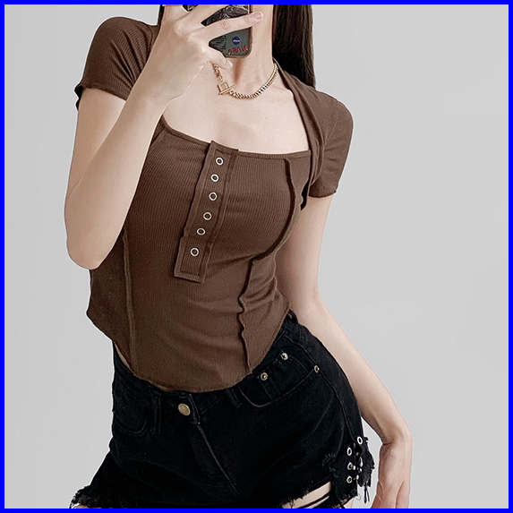Premium Square Neck Short Sleeve Button Crop Top 7010 S M L