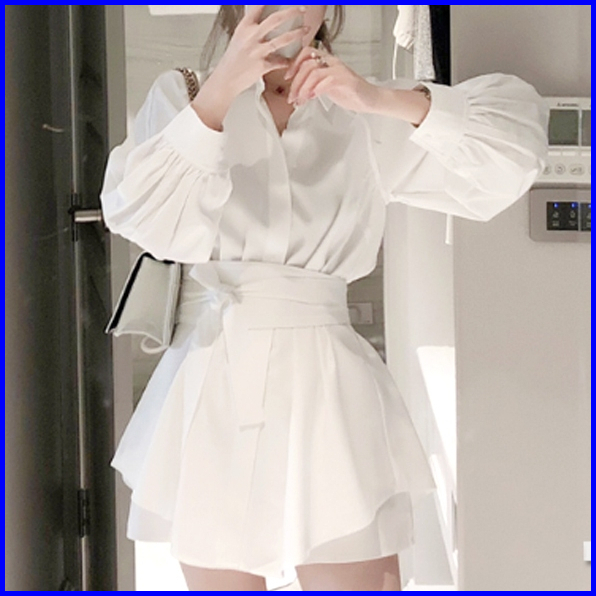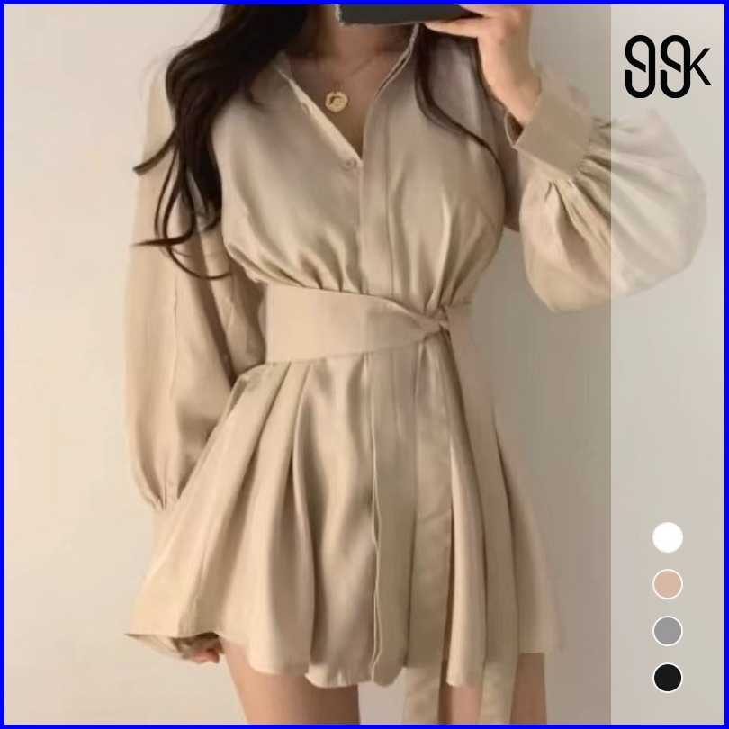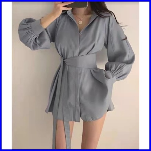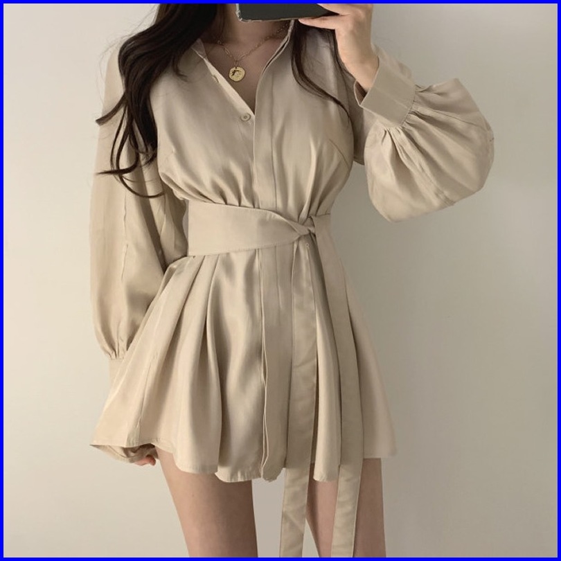 Long Puff Sleeve A Line Button Front Tie Shirt Dress 1456 S-xl