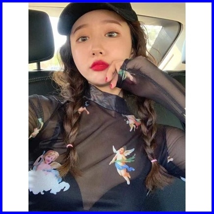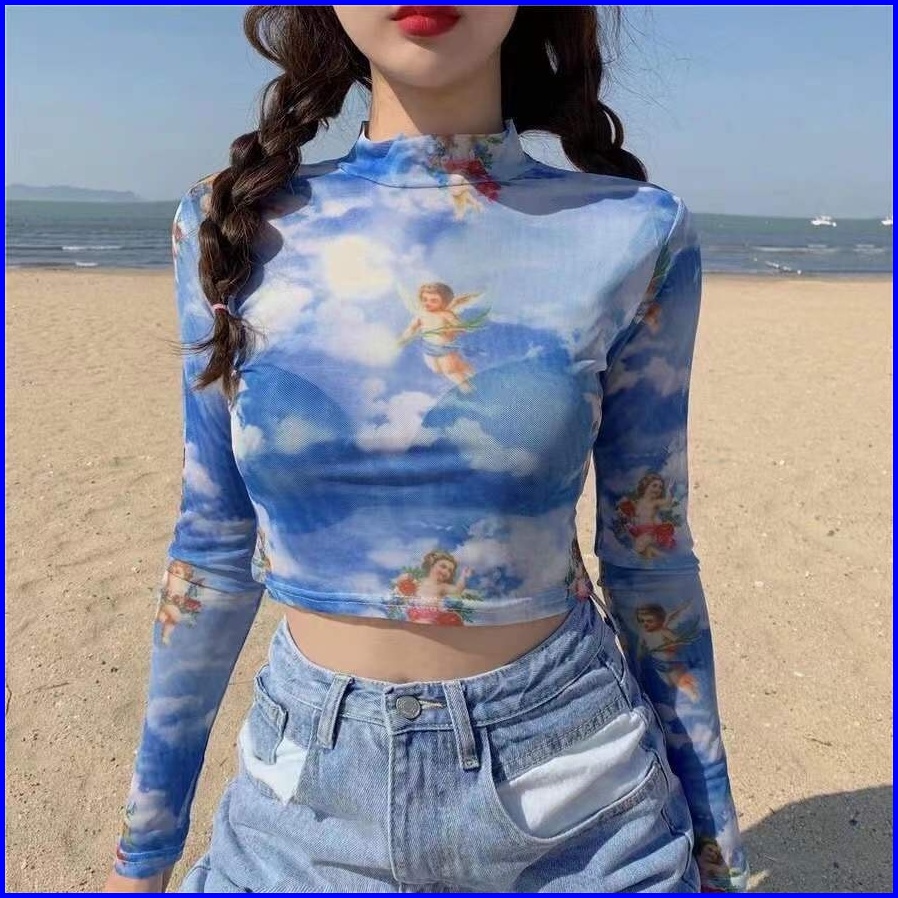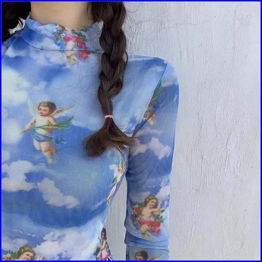 Transparent Tulle Angel Motif Long Sleeve Turtleneck Mesh Top Blouse 2537