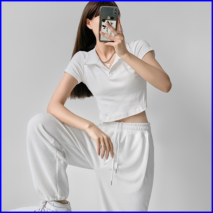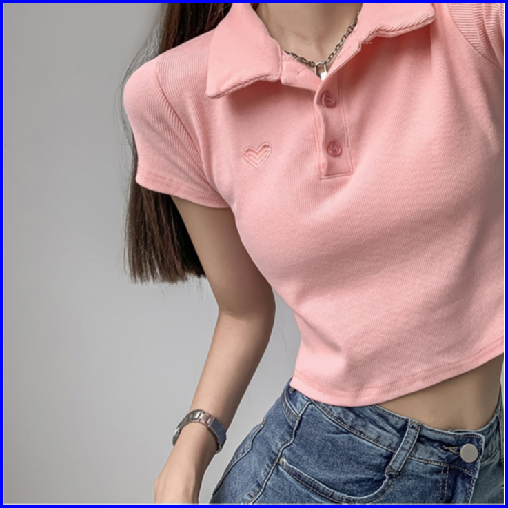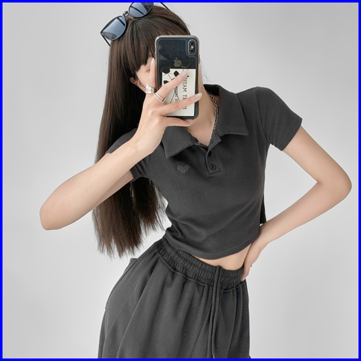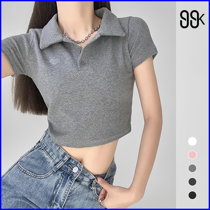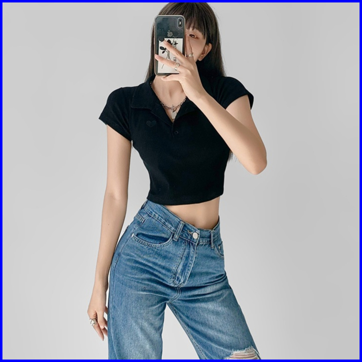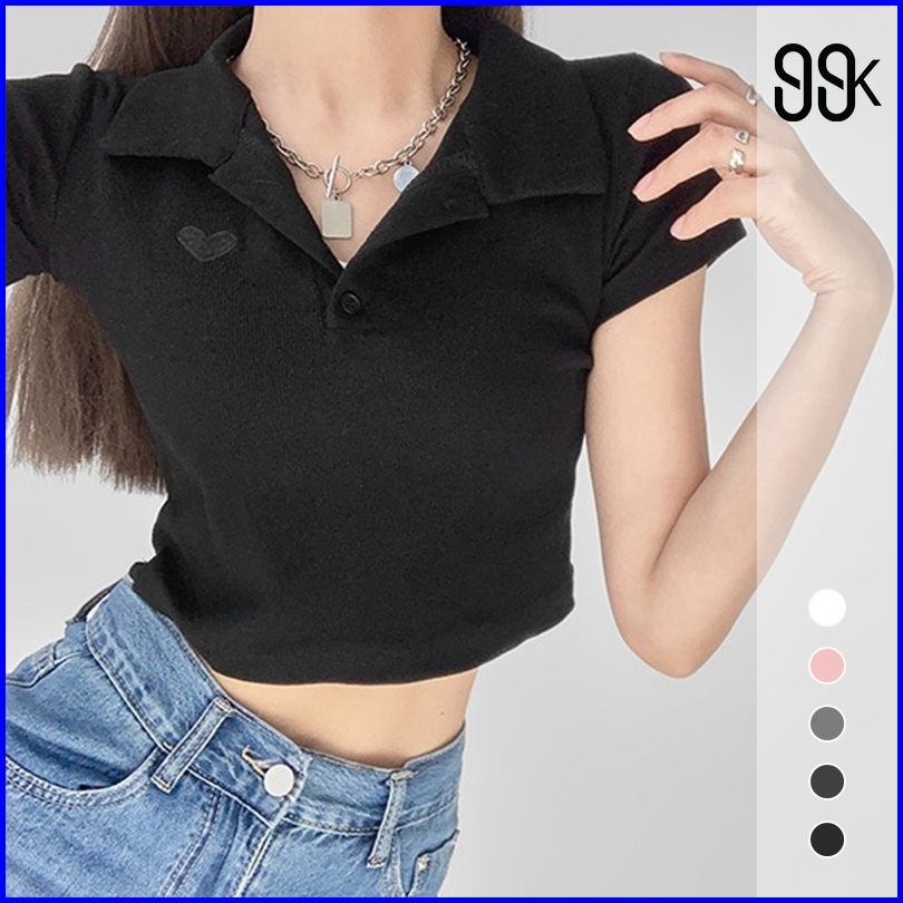 Premium99koutlet Baju Polo Wanita Lengan Pendek Ribbed Atasan Button Up S M L 3061 T-shirt Short Sleeve Crop Top Hitam K