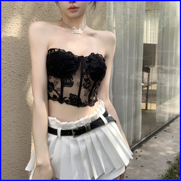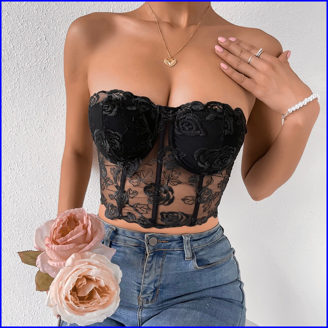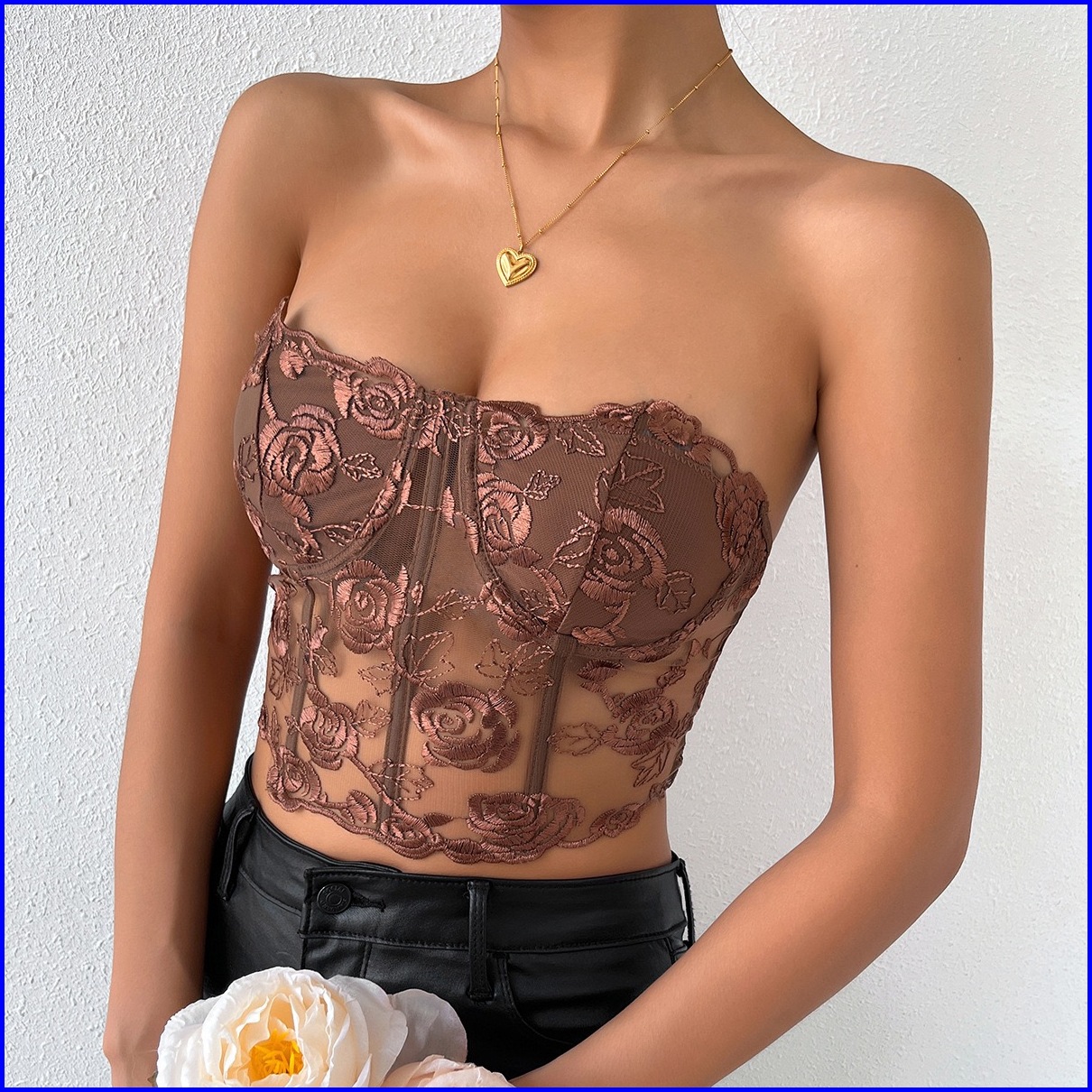 99koutlet Atasan Tube Bustier Floral Wanita Tanpa Lengan Tanktop Backless Embroidery S M L 2246 Vest Lace Inner Crop Tan