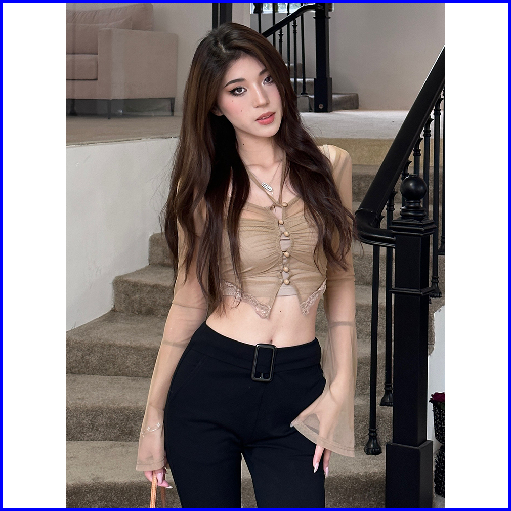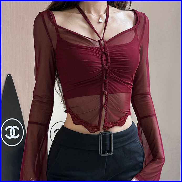 Long Sleeve Blouse Crop Top With Neckline 2852