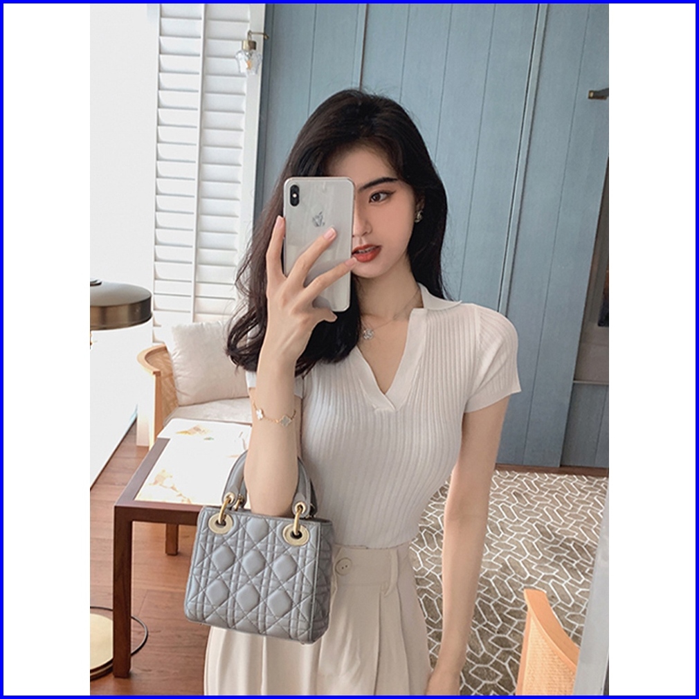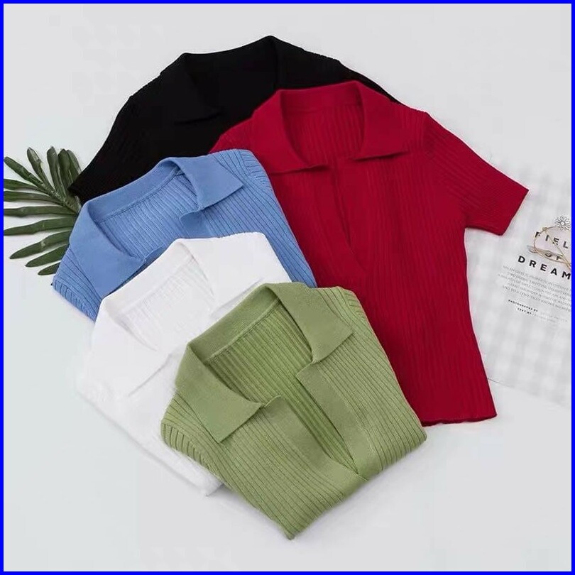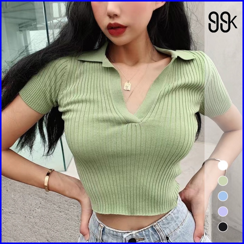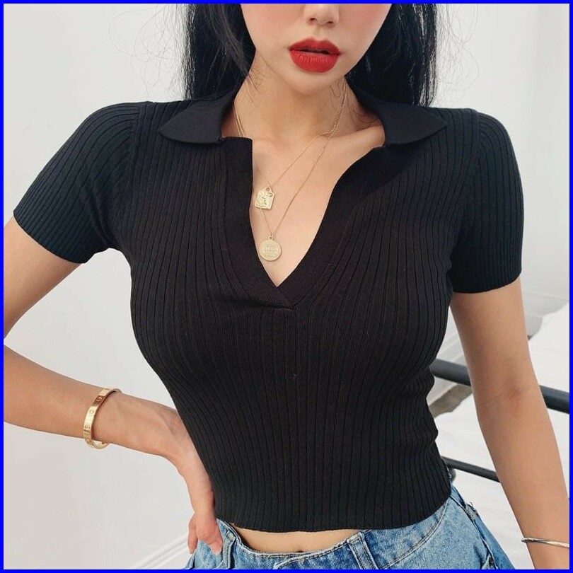V Neck Short Sleeve Ribbed Crop Polo 2572