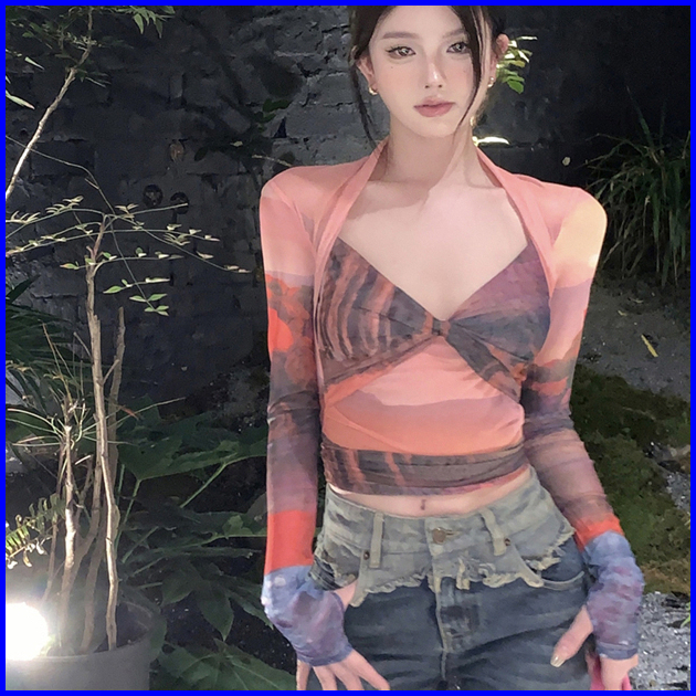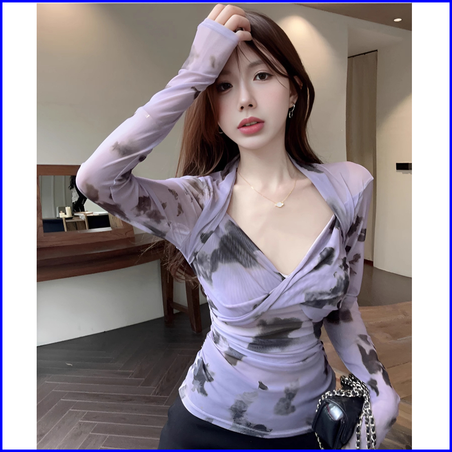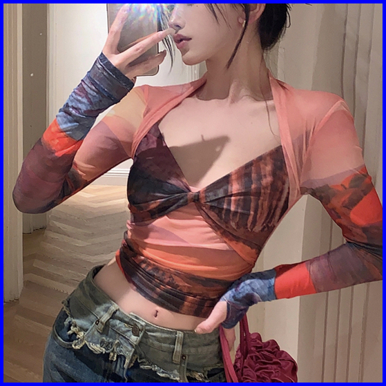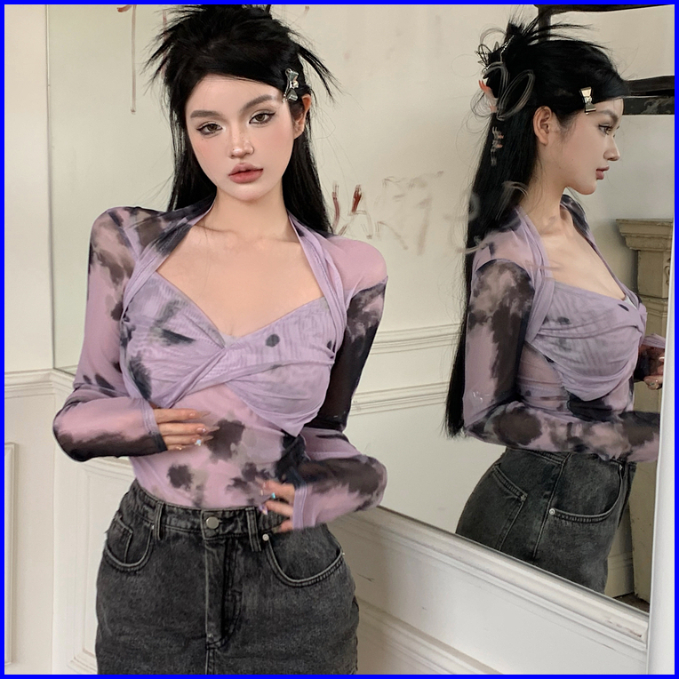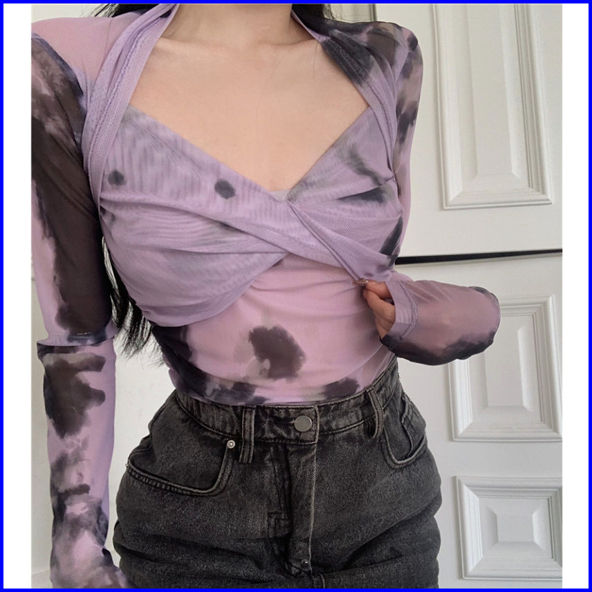 99koutlet Atasan Wanita Crop Top Lengan Panjang T-shirt V- Neck Mesh Transparant 2180 Baju Lace Kaos Sexy Tie-dye