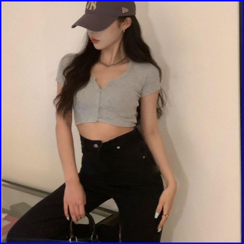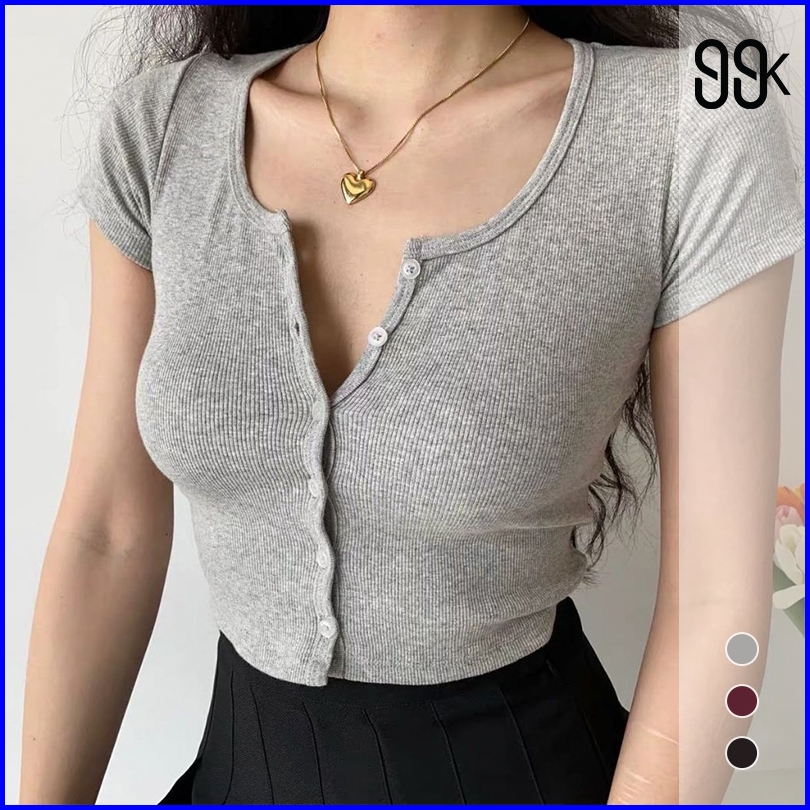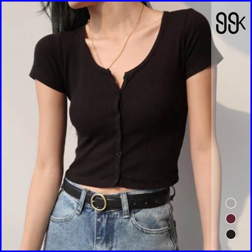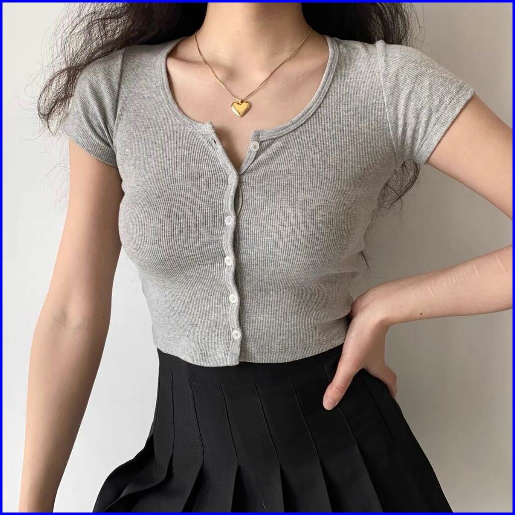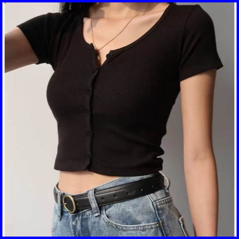 Basic Round Neck Short Sleeve Button Rib Crop Top 1558 S-xl