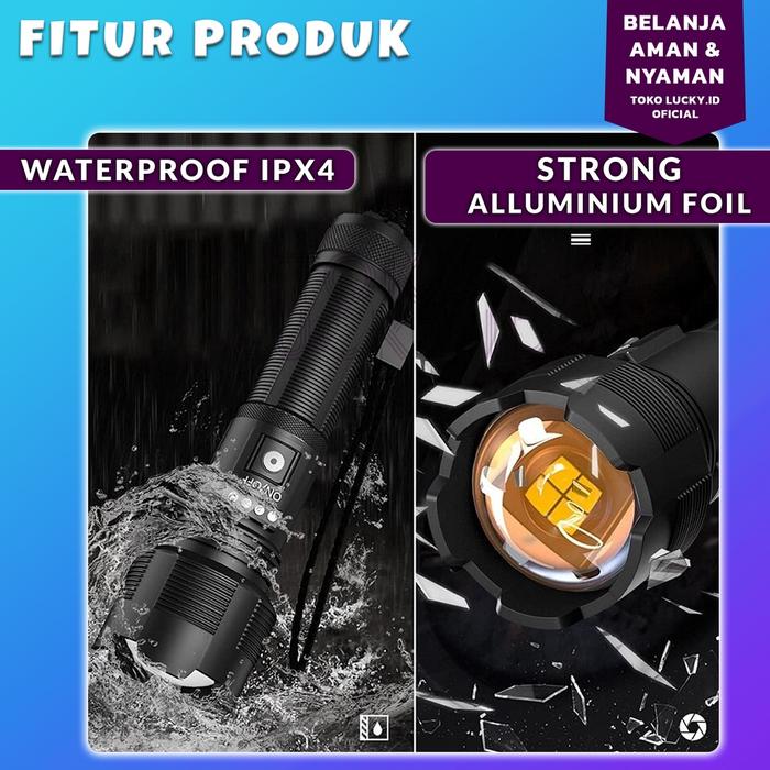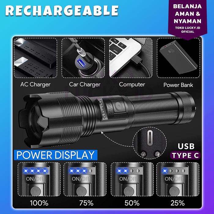 Murah Senter Tactical Super Terang XHP50 USB Type C LED Police SWAT Kapasitas Tinggi Outdoor Tahan Air - Hitam Promo