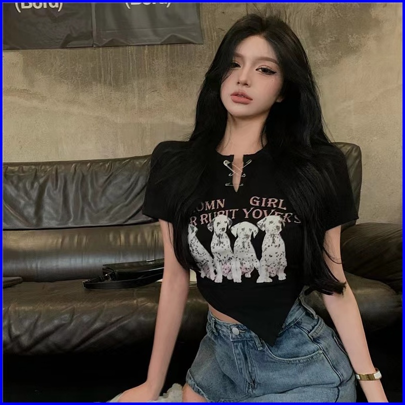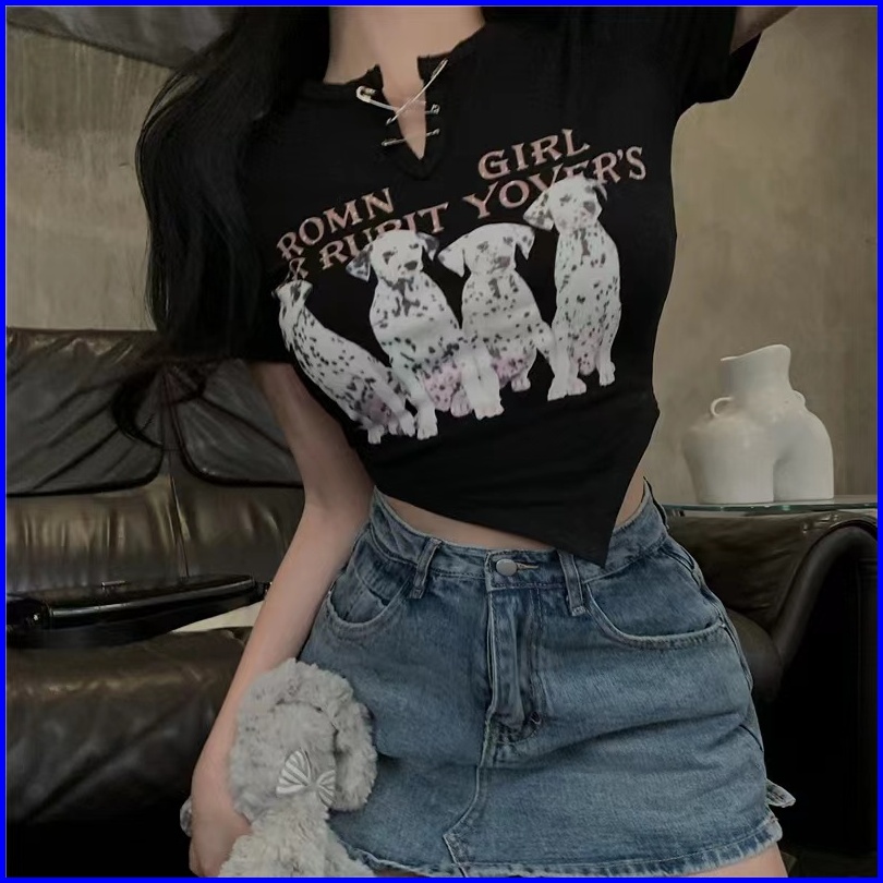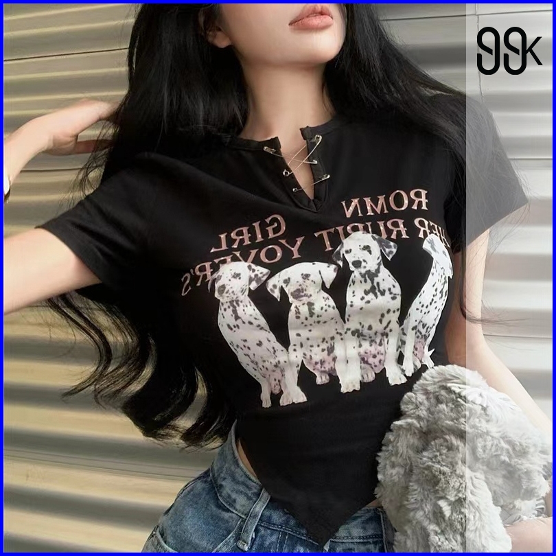 Pin Neck Irregular Crop Top Graphic T-shirt 2173 S M L