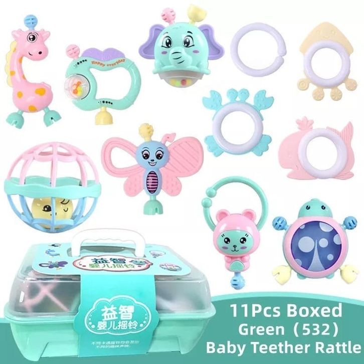 Mainan gigitan karet bayi 0 6 12 bulan teether laki laki perempuan set box kerincian anak anak motorik baby