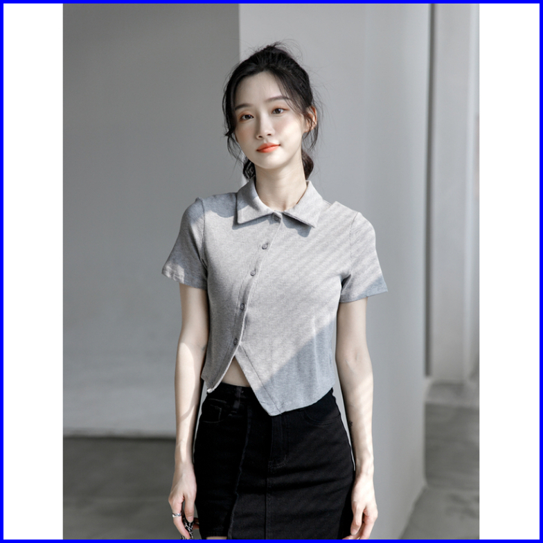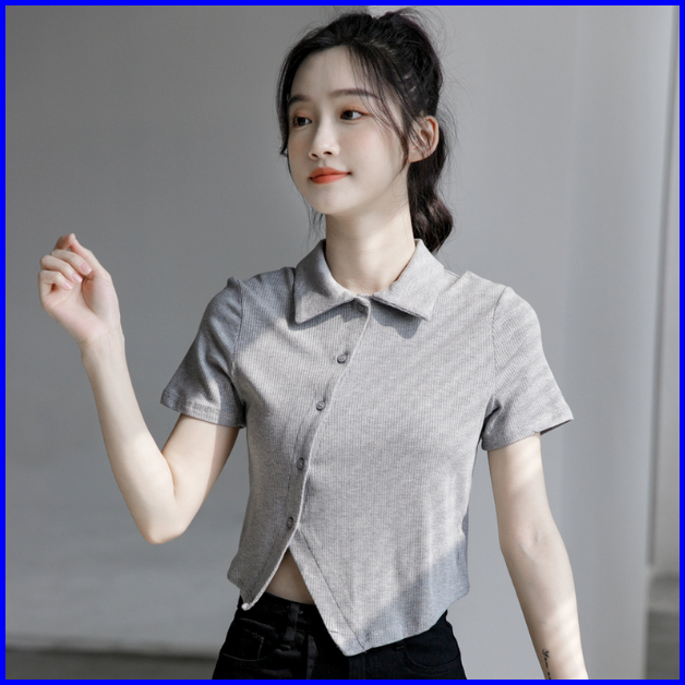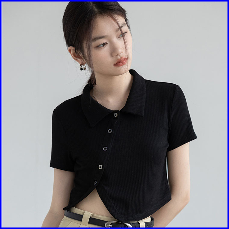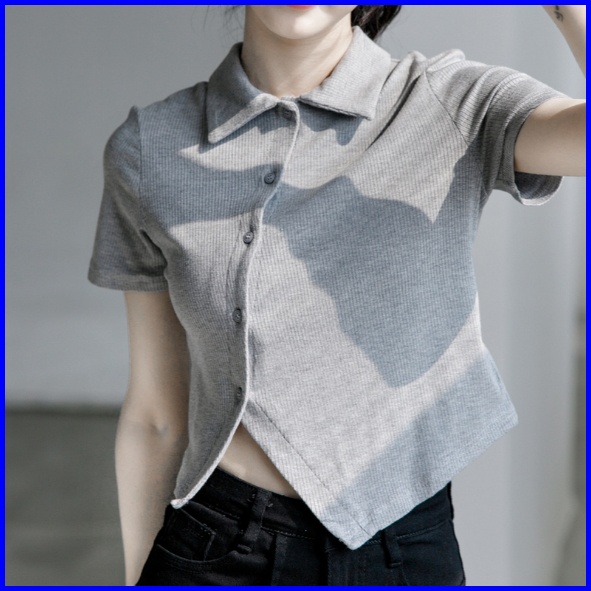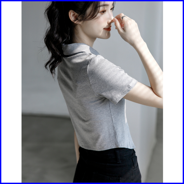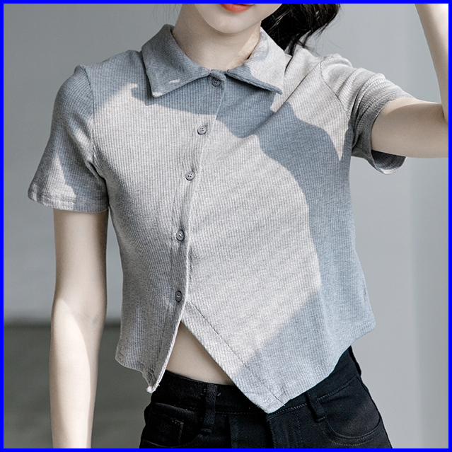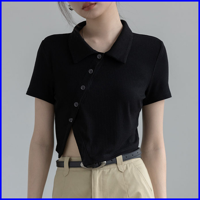 Premium99koutlet Atasan T-shirt Crop Top Wanita Kancing Collar Neck Lengan Pendek S M L 7151 Baju Polos T Shirt Button R