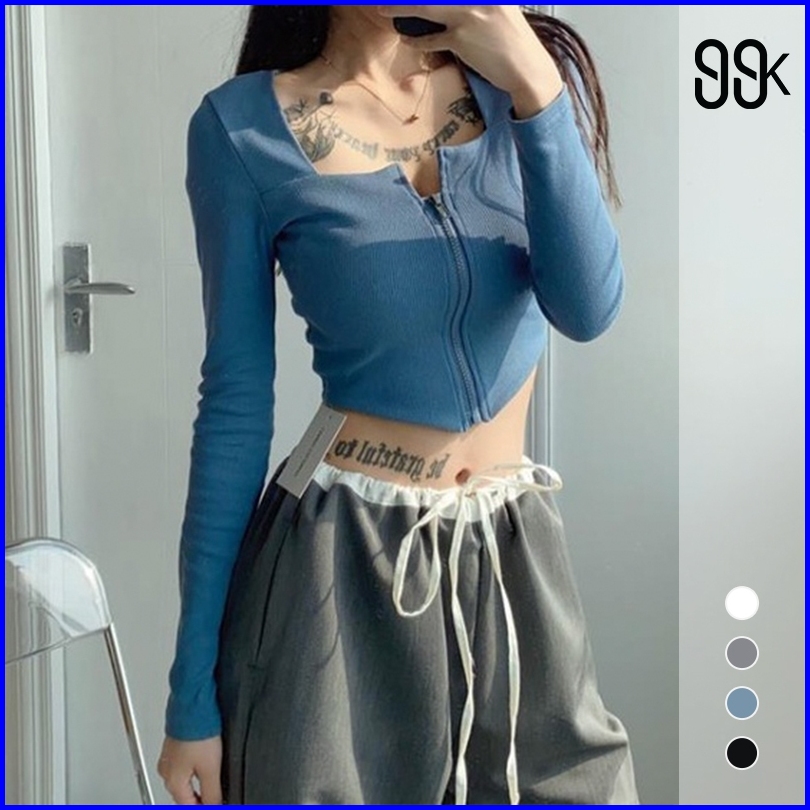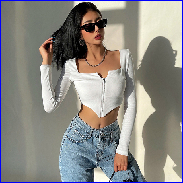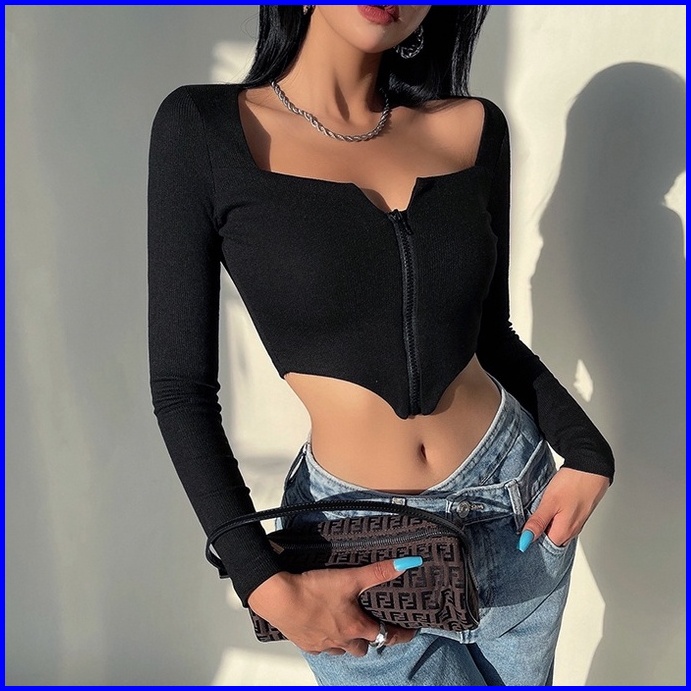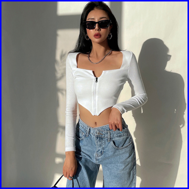 Premium Square Neck Long Sleeve Zipper Crop Top T-shirt 7062 S M L Xl