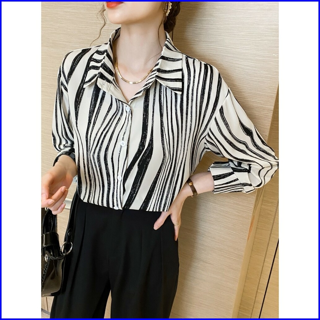 Loose Fashion Korea Chiffon Beige Black Striped Long Sleeve Shirt For Women Office Work Casual Tops