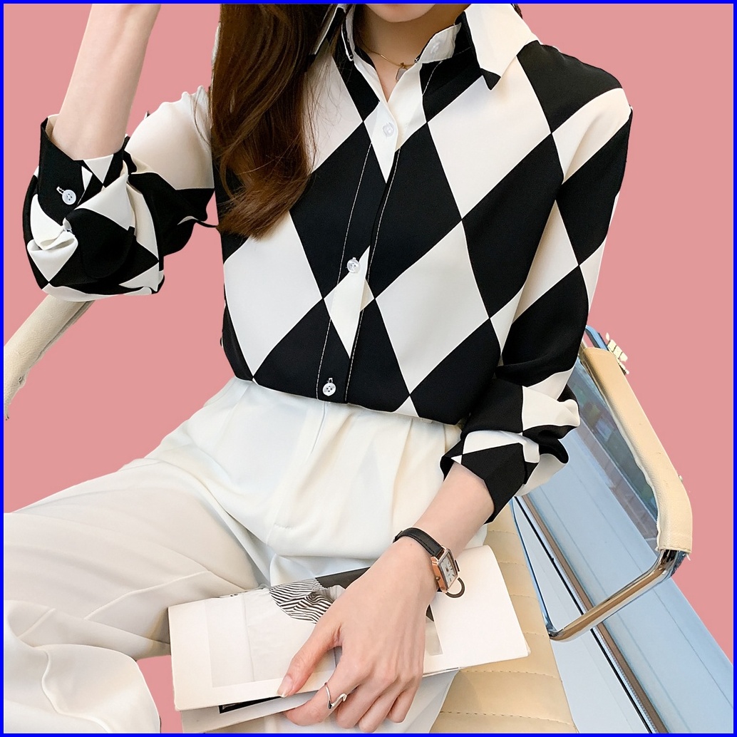 Kain Berkualitas Tinggi Fashion Korea Kisi Hitam Dan Putih Kemeja Profesional Lengan Panjang Wanita Atasan Resor Kasual