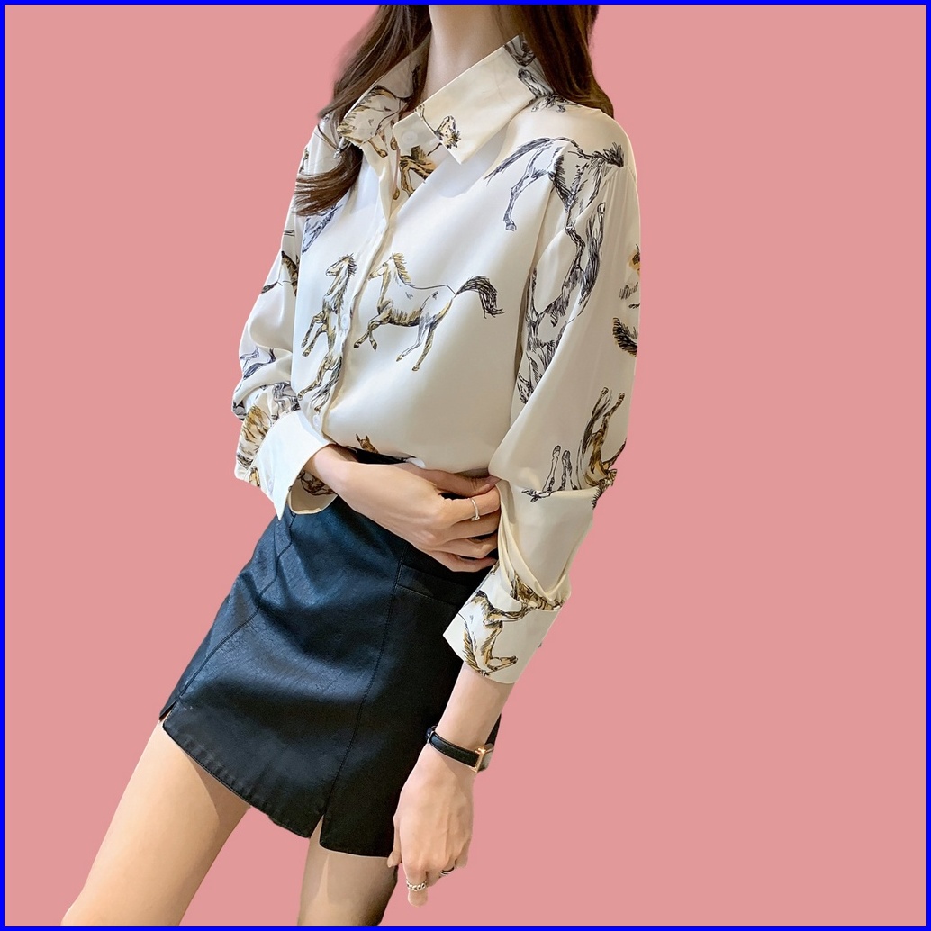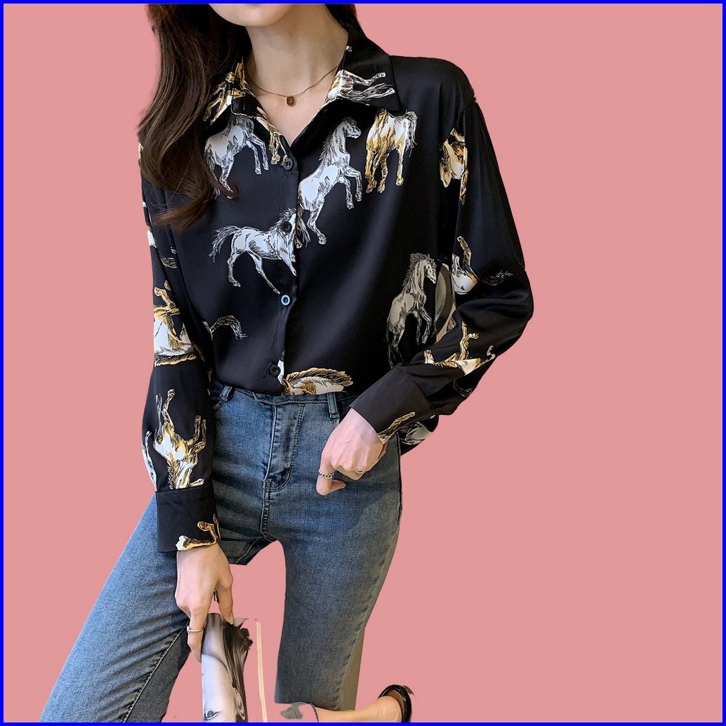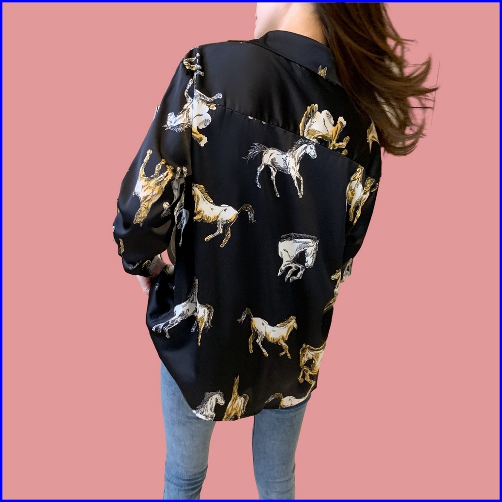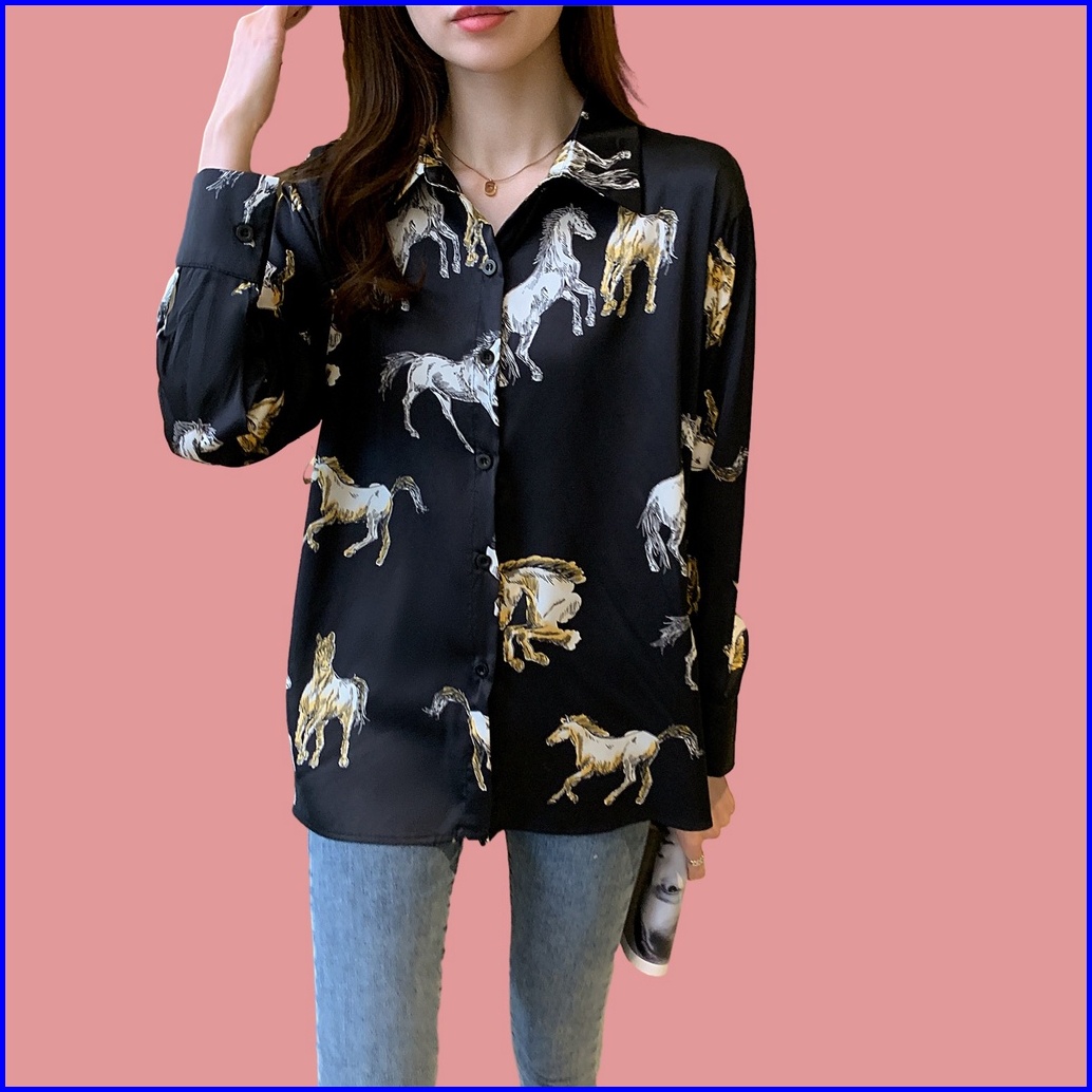 Kain Berkualitas Tinggi Fashion Korea Krem Hitam Cetak Kuda Grafis Kemeja Lengan Panjang Musim Semi Musim Panas Musim Gu