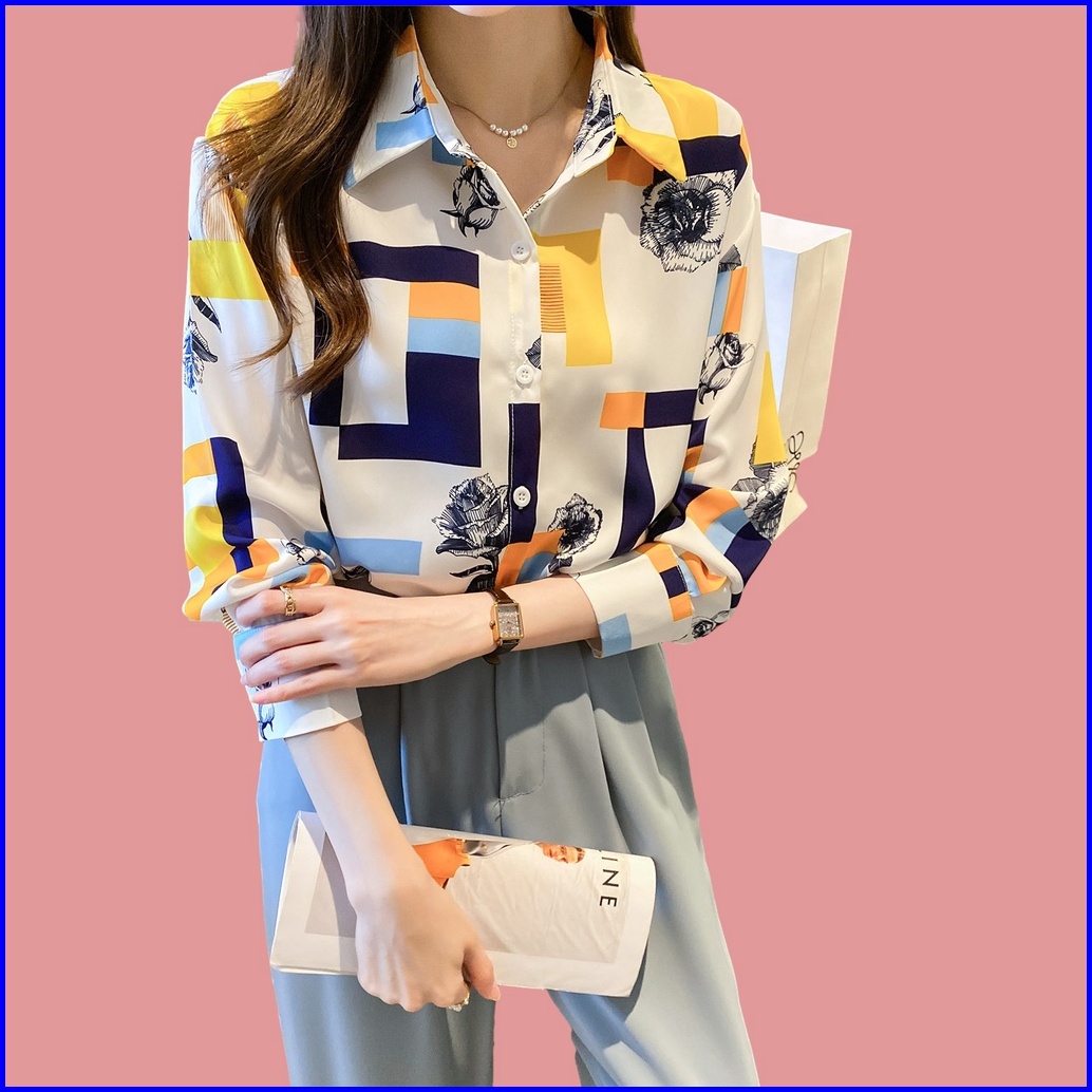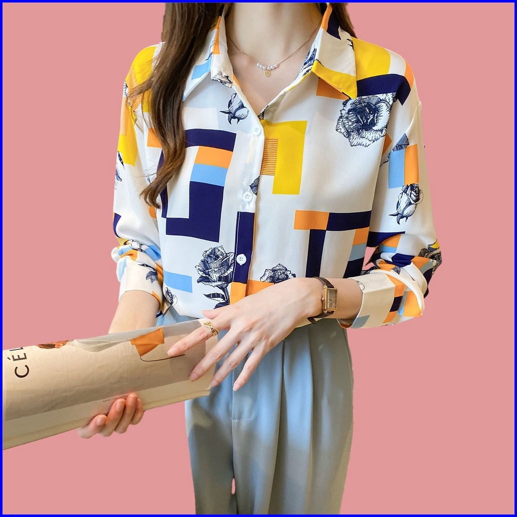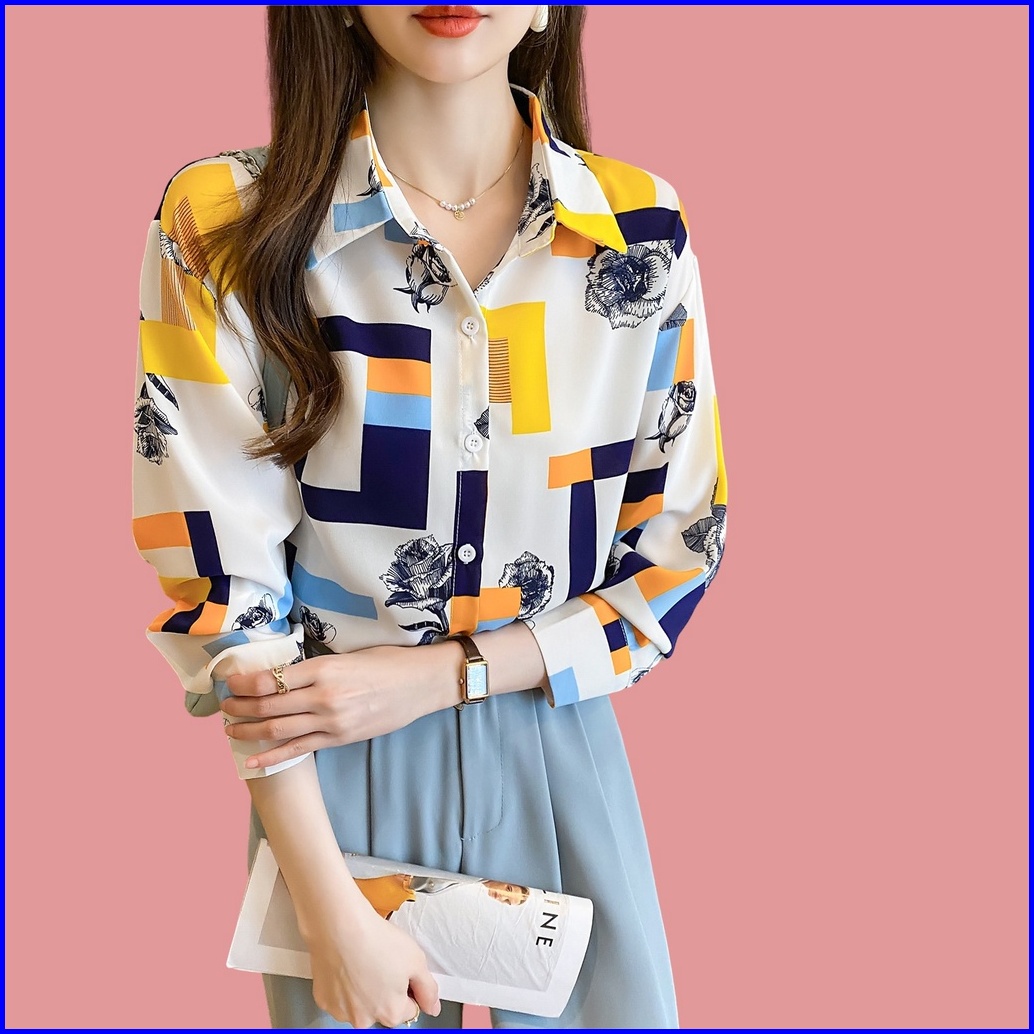 New.fashions In Stock High Quality Chiffon Fabric Yellow Red Color Block Printing Women S Work Casual Long Sleeve Shirt