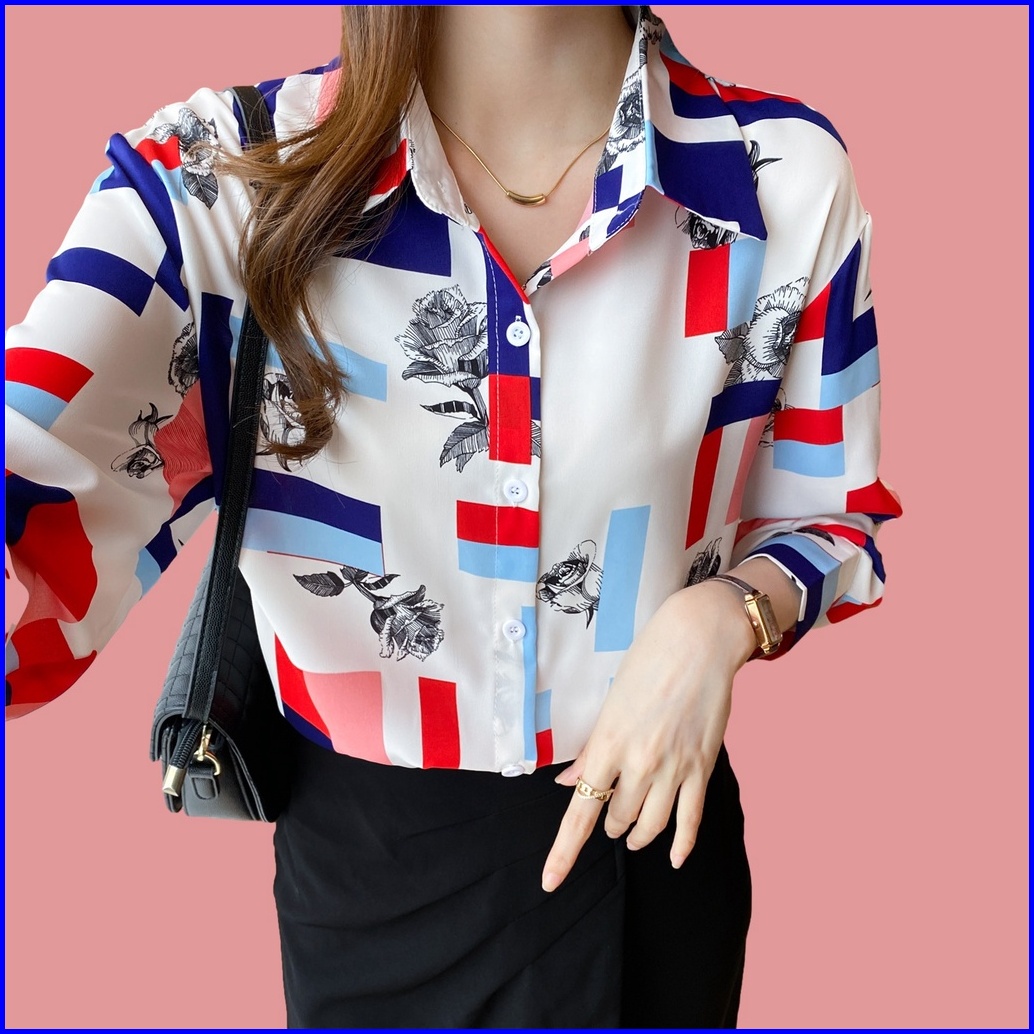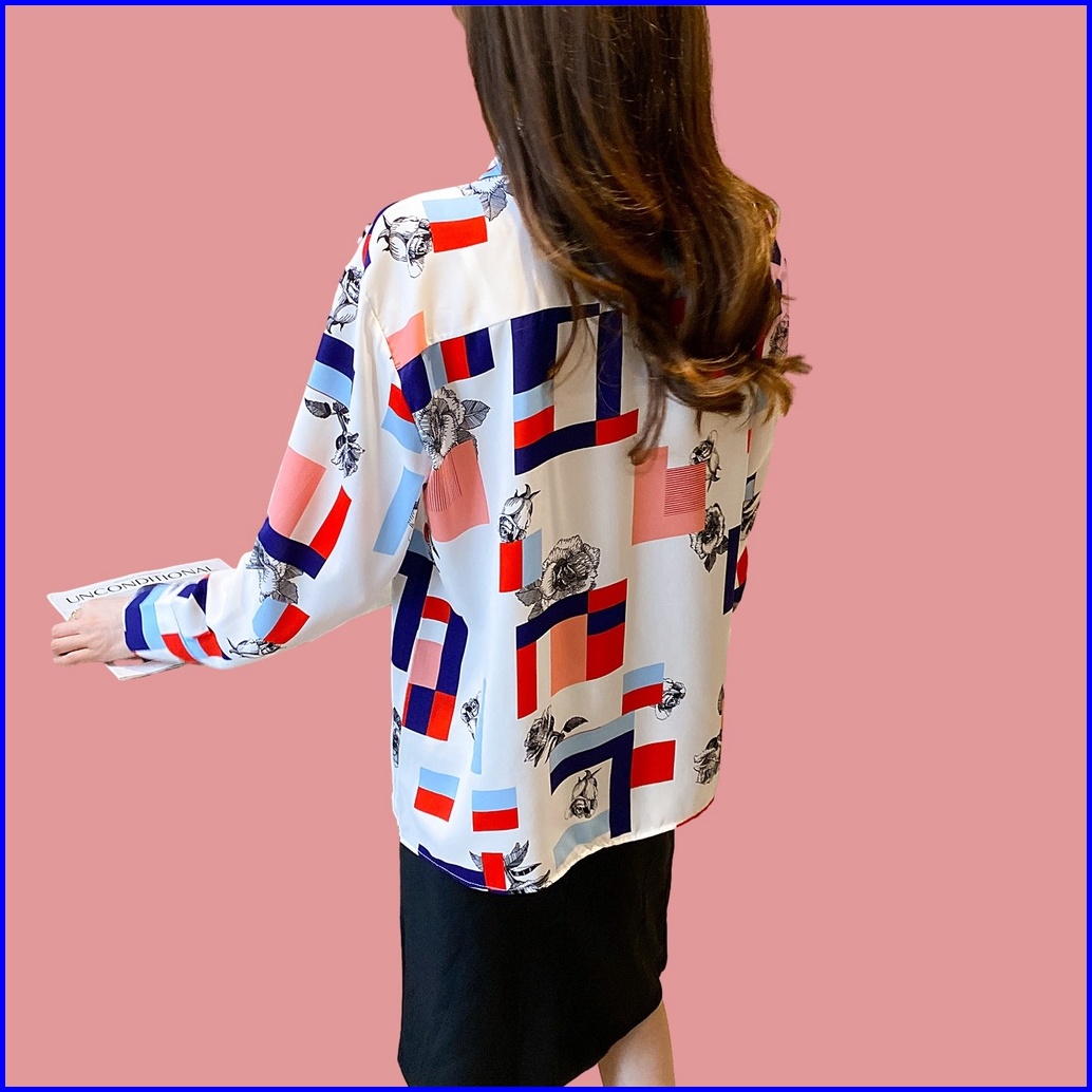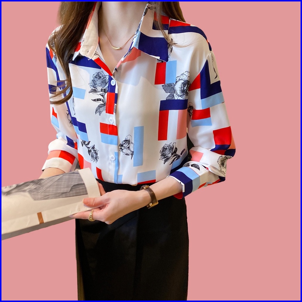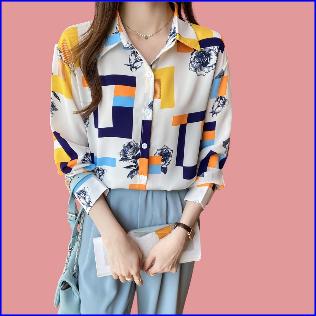 New.fashions In Stock High Quality Chiffon Fabric Yellow Red Color Block Printing Women S Work Casual Long Sleeve Shirt