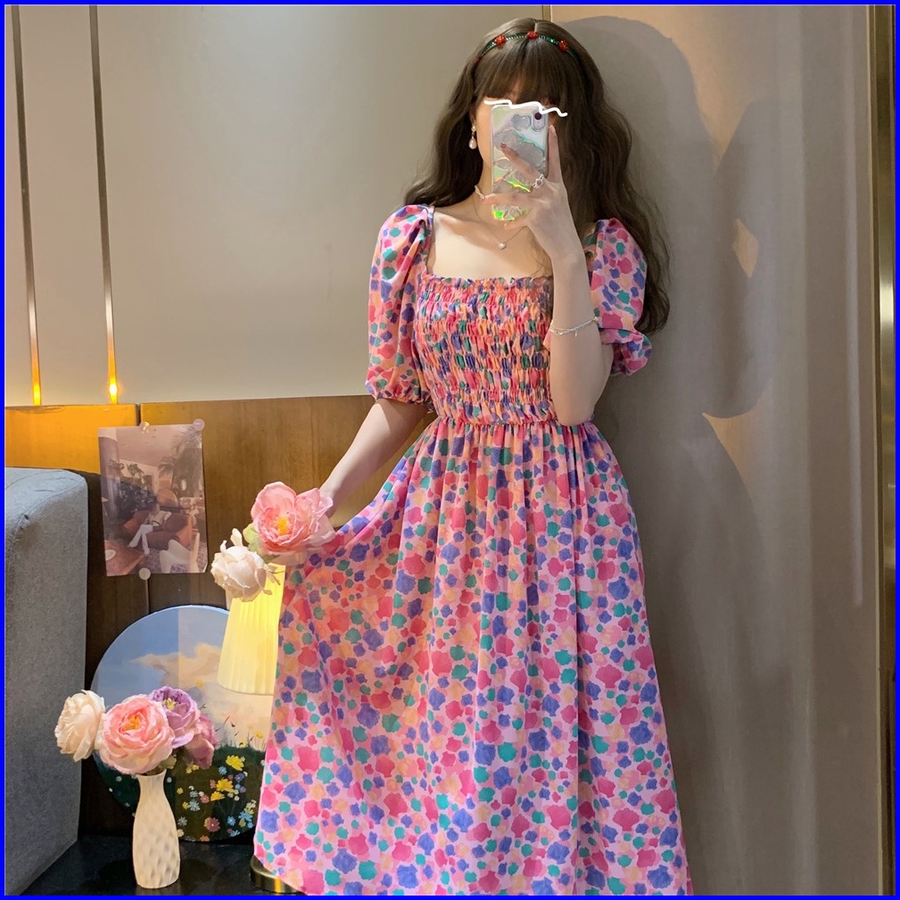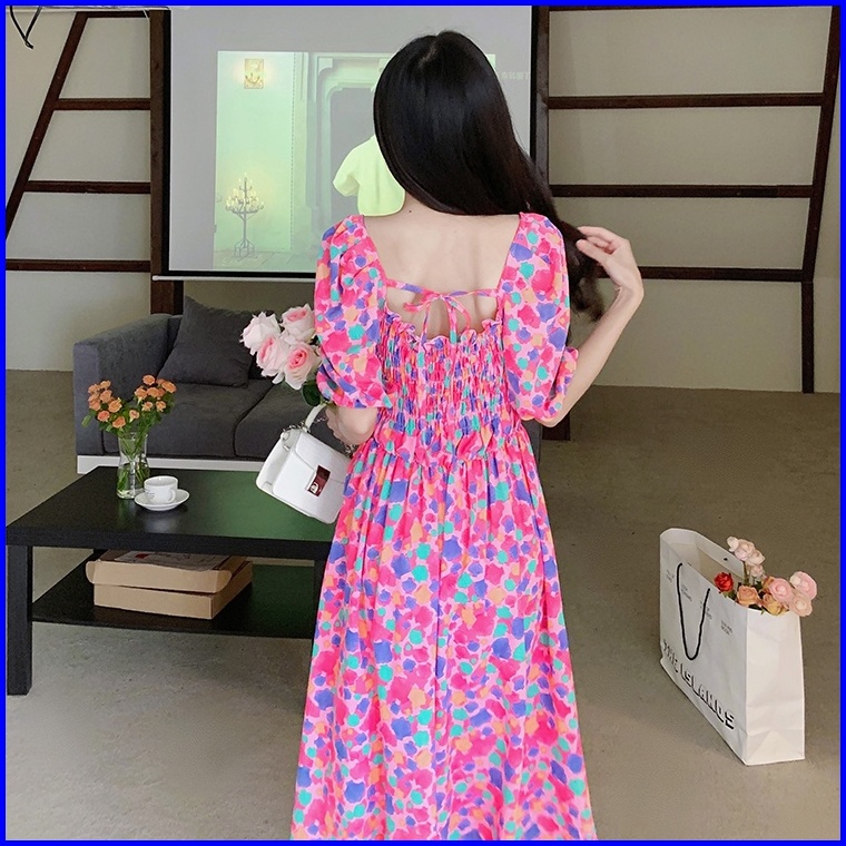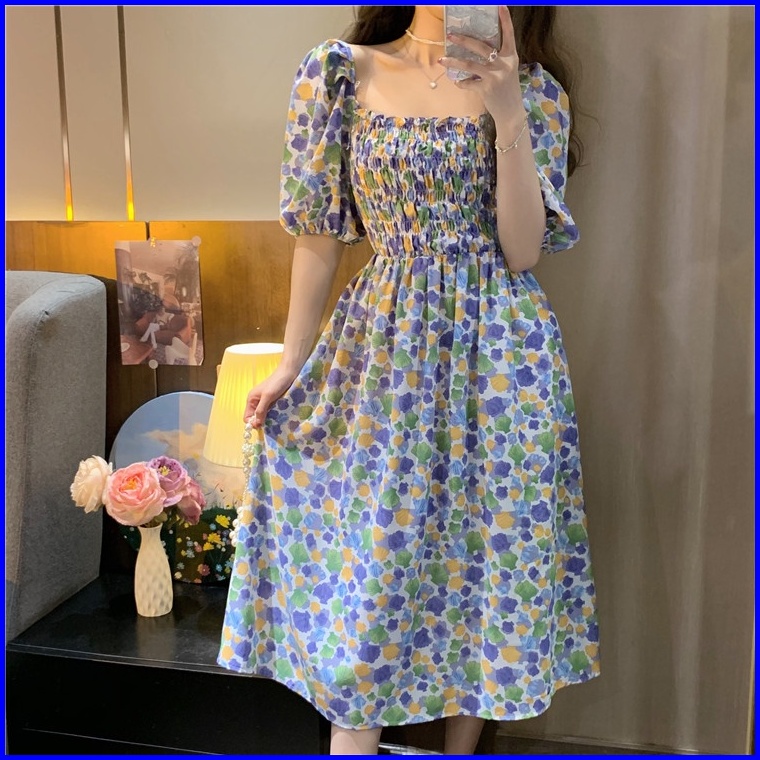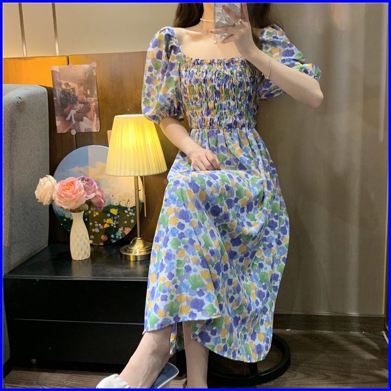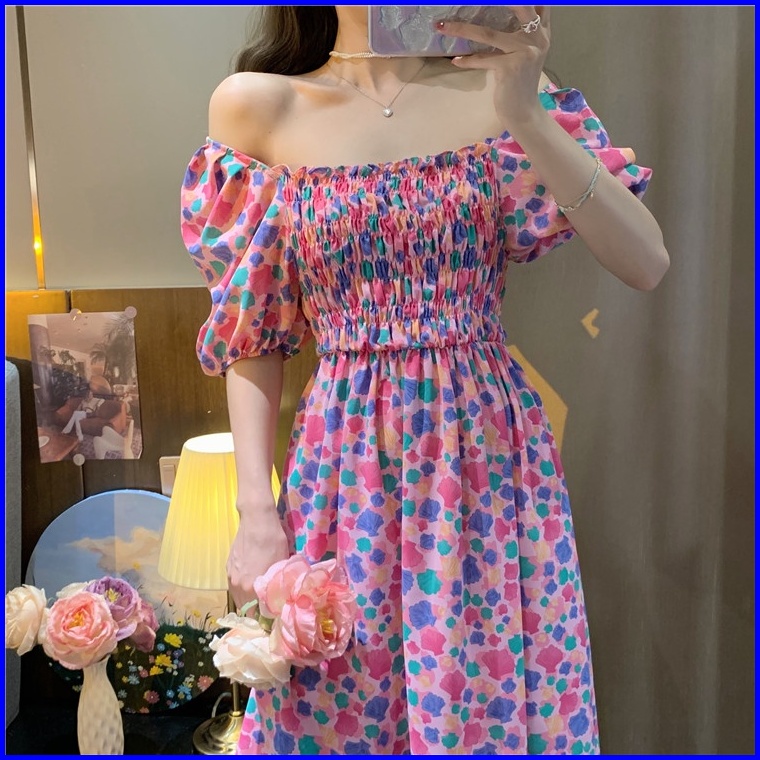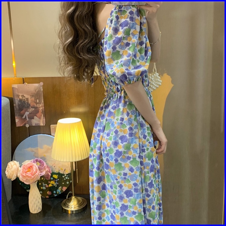 Fashion Chiffon Floral Casual Blue Summer Short Sleeve Sexy Off Shoulder Women Beach Bali Midi Dress