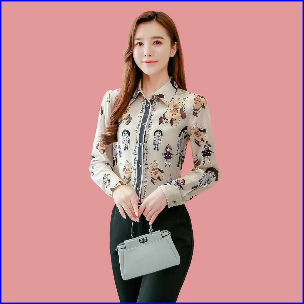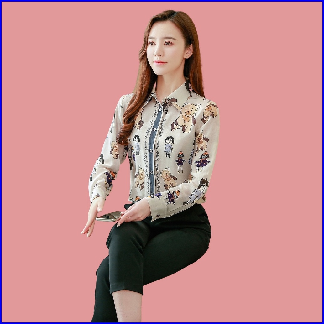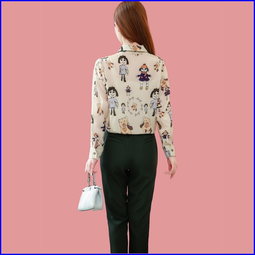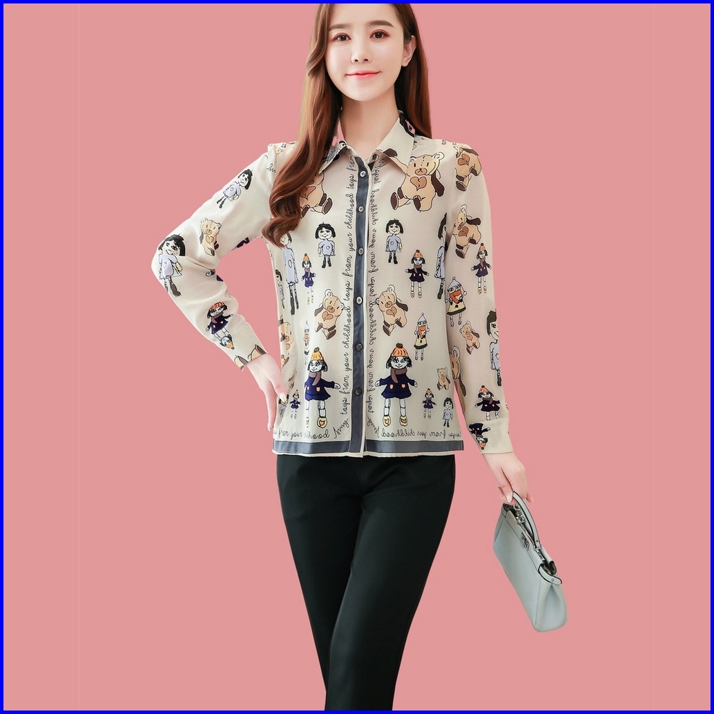 Rayon Satin Fabric Smooth And Soft Kawaii Cartoon Print Long Sleeve Women S Shirt Work Office Casual Tops
