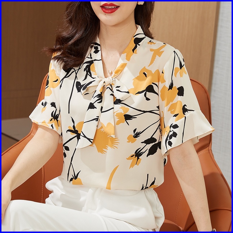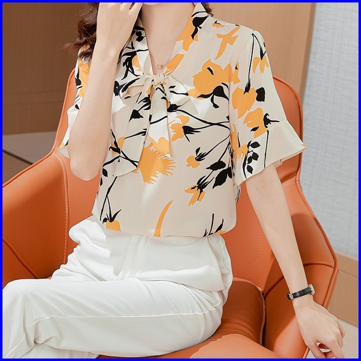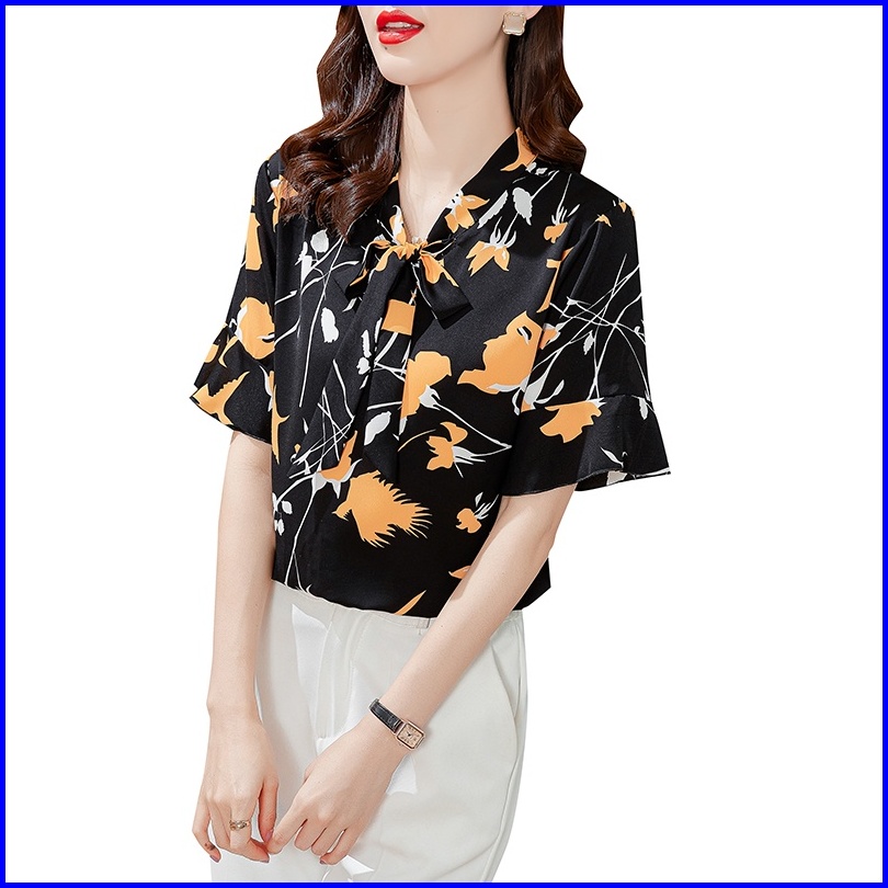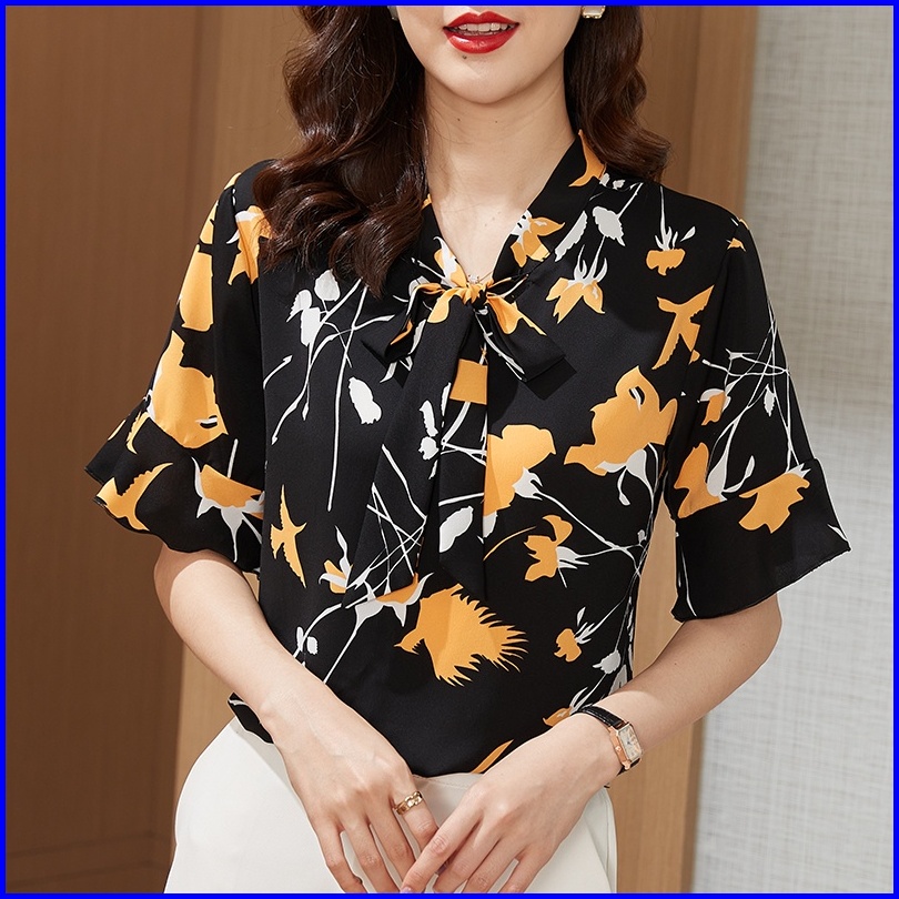 New 2022 Fashion Korean Floral Summer Short Sleeve Shirts Black White Women Blouse Tops Blus Wanita Lengan Pendek