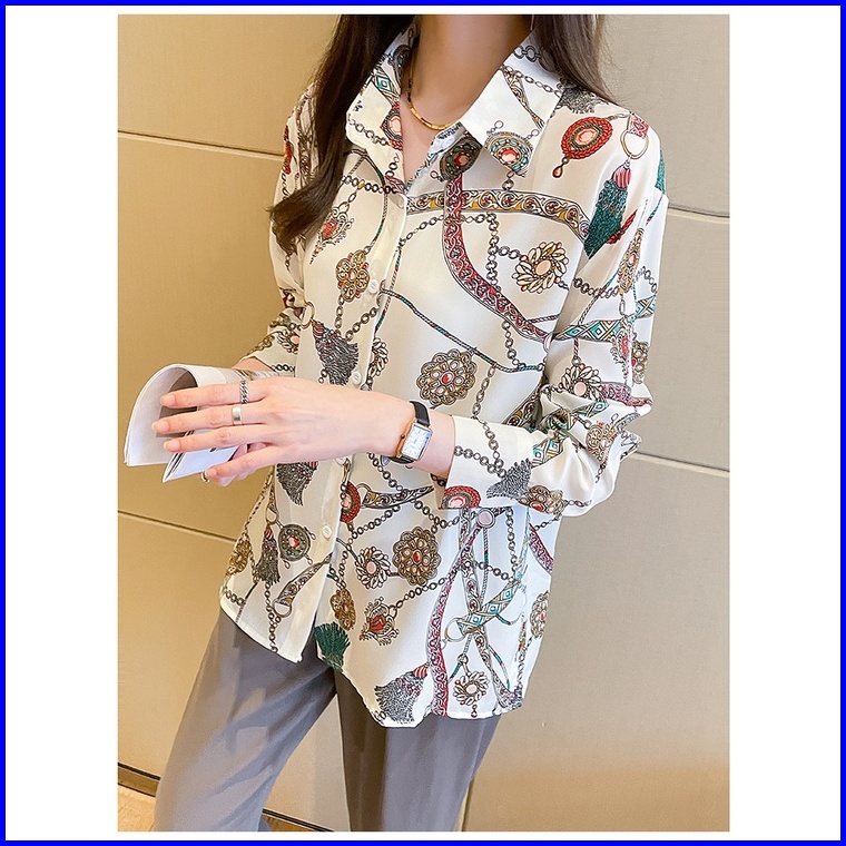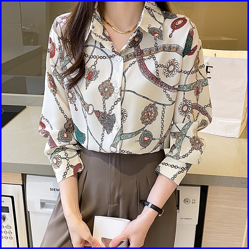 2023 New Fashion Korean Personalized Print Casual Work Long Sleeve Women Shirt Kemeja Wanita Lengan Panjang