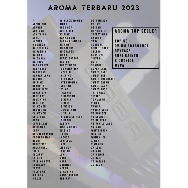 AgnesMo/Honey Moon, AignerBlack/BlackJac, AignerDebut/Debut, Alphard/Alpha Ori, Amor/Sunmori, AngelHrt/HeartButton, AnsDream/Sweet Dream, AnsFancy/HanaGlamour, AnsRose/Sweet Rose, AnsSecret/Hana Code, Aqua De Gio Man, AquaMan/Its Me, ArianaGrande/Arande, ArielNoah/V Man, AvrilLavigne/Avne, AvrilRose/Kiss&Rose, AyuTing2/Ask Think, BabaCoffee/BabaKahve, Benetton/BB Pink, BlackCofe/CoffeeStar, BlueEmotion/Blue Art, BritneySpr/BS Woman, Bubble Gum/Bubble Be, Bulgary/BA Extreme, Bulgary/BA Jasmine, Bulgary/BA Omnia, BulgaryAqua/BA Man, CR7Platinum/CR7P, ChanelCoco/Coco, CkBee/Sweet Bee, CuddleBaby/Baby Face, D&GImperact/Detectiv, Davidoff/Cold Man, Dior/Crisdi Sauvag, DunhilBlue/Blue Sky, EscadaChery/Escarry, EscadaMoon/Ex Moon, FerariBlack/Ferblack, Fullman, GG Black Woman, GiorgioArmani/Gioar, Green Tea, Guci/G Flora, Guci/G Rush, Gues/Gs Pink, HarajukuLov/TopJapan, HugoBoss/HB XX, Imperial, Incanto/In Shine, IsseyMiyake/Issey Mi, Jaguar/Jg Black, Jaguar/Jg Blue, Jaguar/Jg Vixion, JapanesChry/JP Chery, Jesica/J Parker, Jlo/Jl Still, JoMalone/JmEnglishP., Kasturi, Kenzo/Zo Bali, Kenzo/Zo Batang, Kenzo/Zo Daun, Kiss Me, LacosteEssent/Lacost, LalisaPM/Mika Pink, Lanvin/Modern L, Lifebuuooy, Lovely/Love Me, Luux, Maherzein/Main, Melon, Nagita/Azzura, OllaRamlan/Winter, OneDirection/One Way, Pacorabane/Pc Inv, ParisHilton/Eiffel, PoloSport/PS Man, RafiAhmd/Superstar, Scandal, Scarlet/Sasa, SelenaGmz/Selego, SexyGravity/Sexy Gvt, Soft, Tajmahal, TaylorSwft/SweetBale, Tissue, Vanilla, Vanilla Susu, VanillaC/SweetCoklat, Victoria/Vs Bomshell, Victoria/Vs Secret, Victoria/Vs So Sexy, White Musk, Woman Ice, Zara/Za Love, Zara/Za Man, Zara/Za Woman