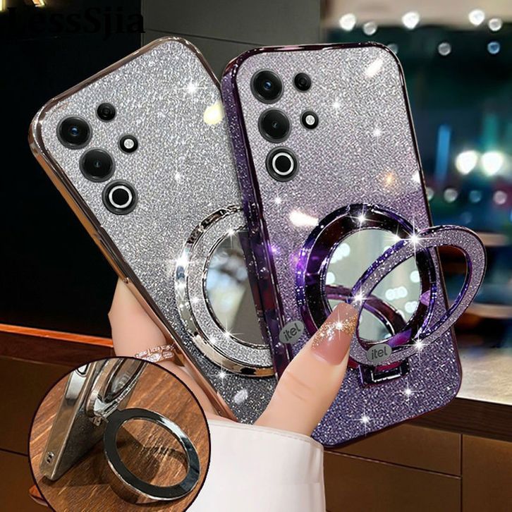 Soft Cas Casing itel Phone cover itel S25 Ultra Back case with Makeup Mirror Holder Stand Luxury Shiny9radient Plating